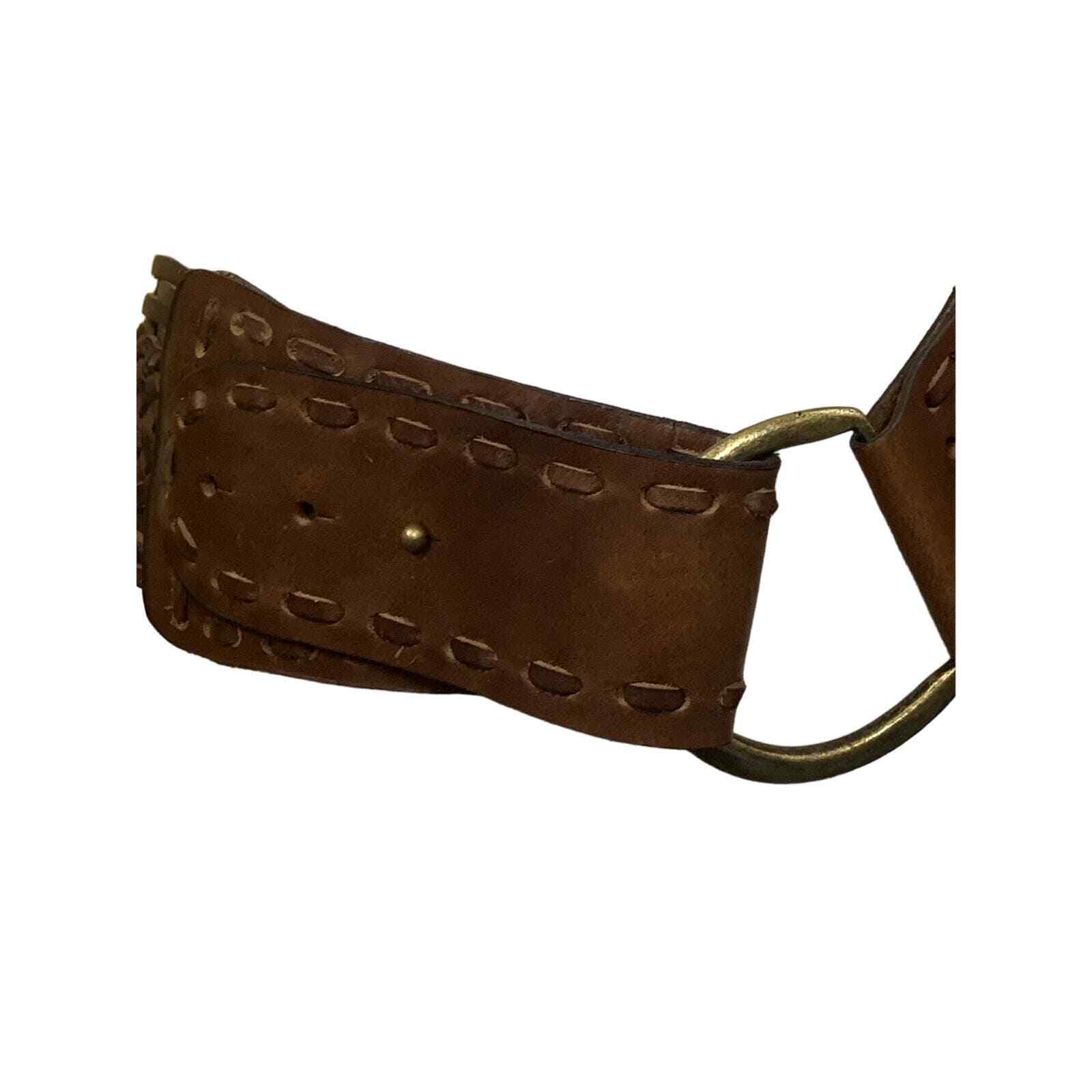 Wide brown braided leather belt, brass ring, snap closure, bohemian, artsy, ML