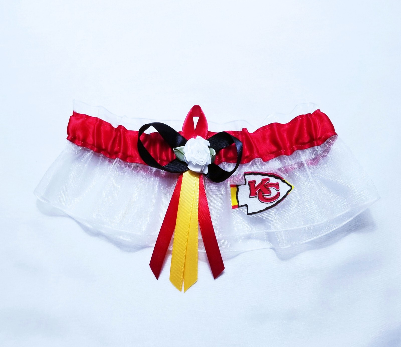 как выглядит White Organza Wedding/Prom Garter Set, Red/Gold/White Ribbons, Flower, 19-22" фото