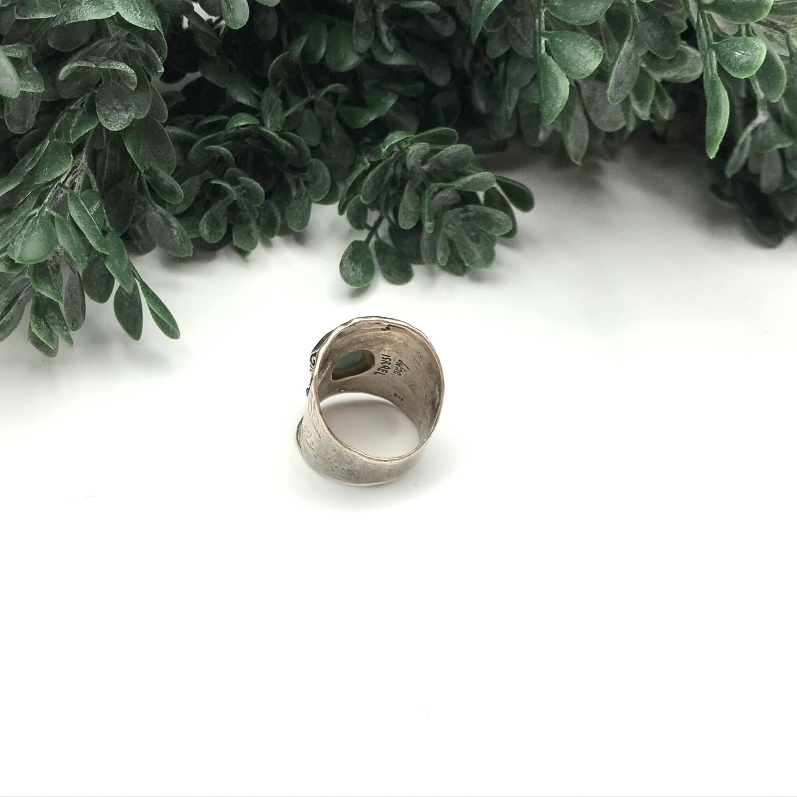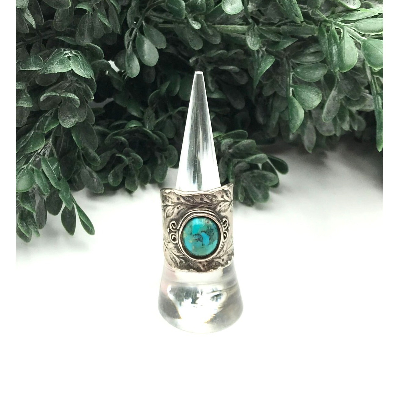 Vintage sterling ring, wide silver tone band, oval turquoise gem