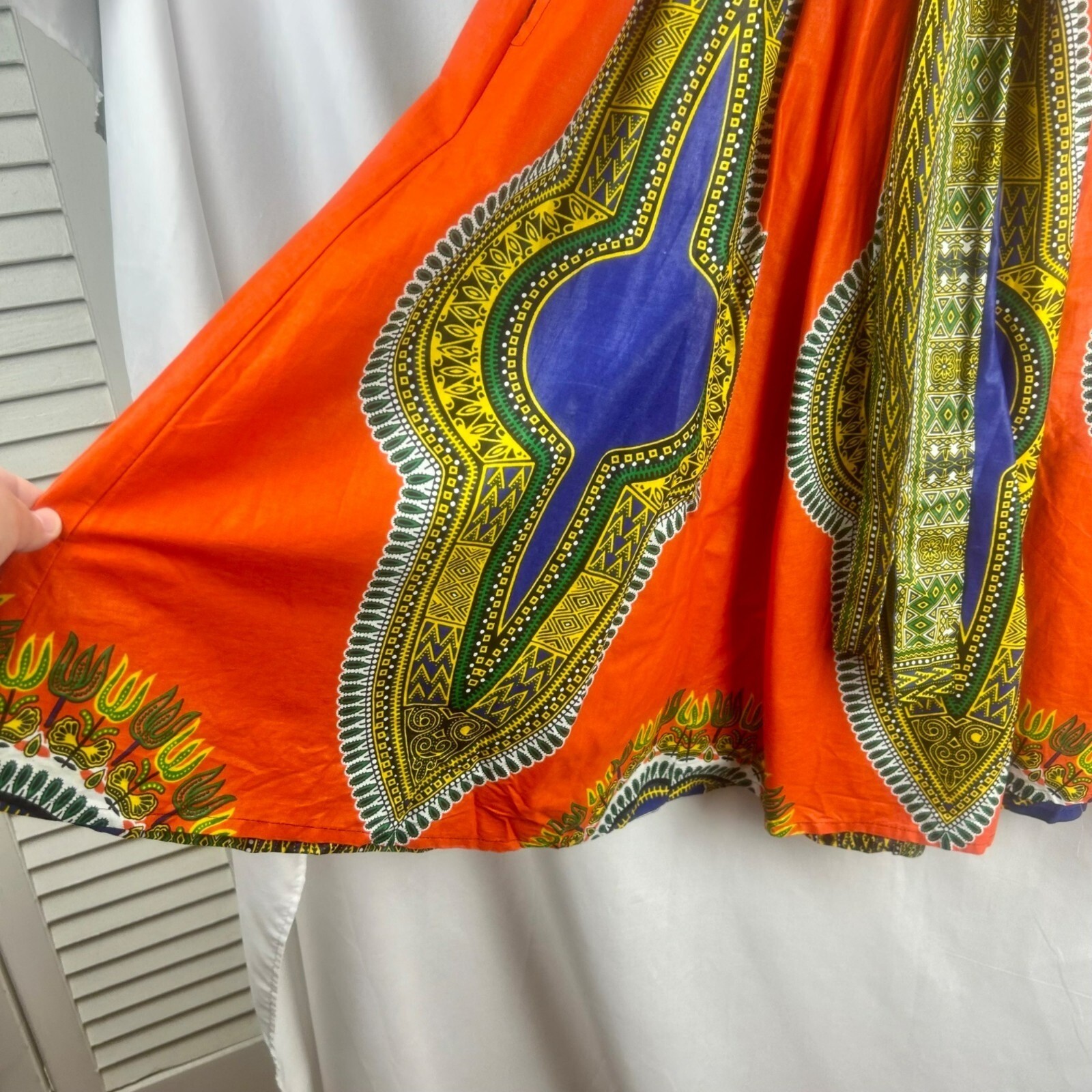 African Kente Dashiki Midi Skirt Women One Size Orange Elastic Waist Full A Line