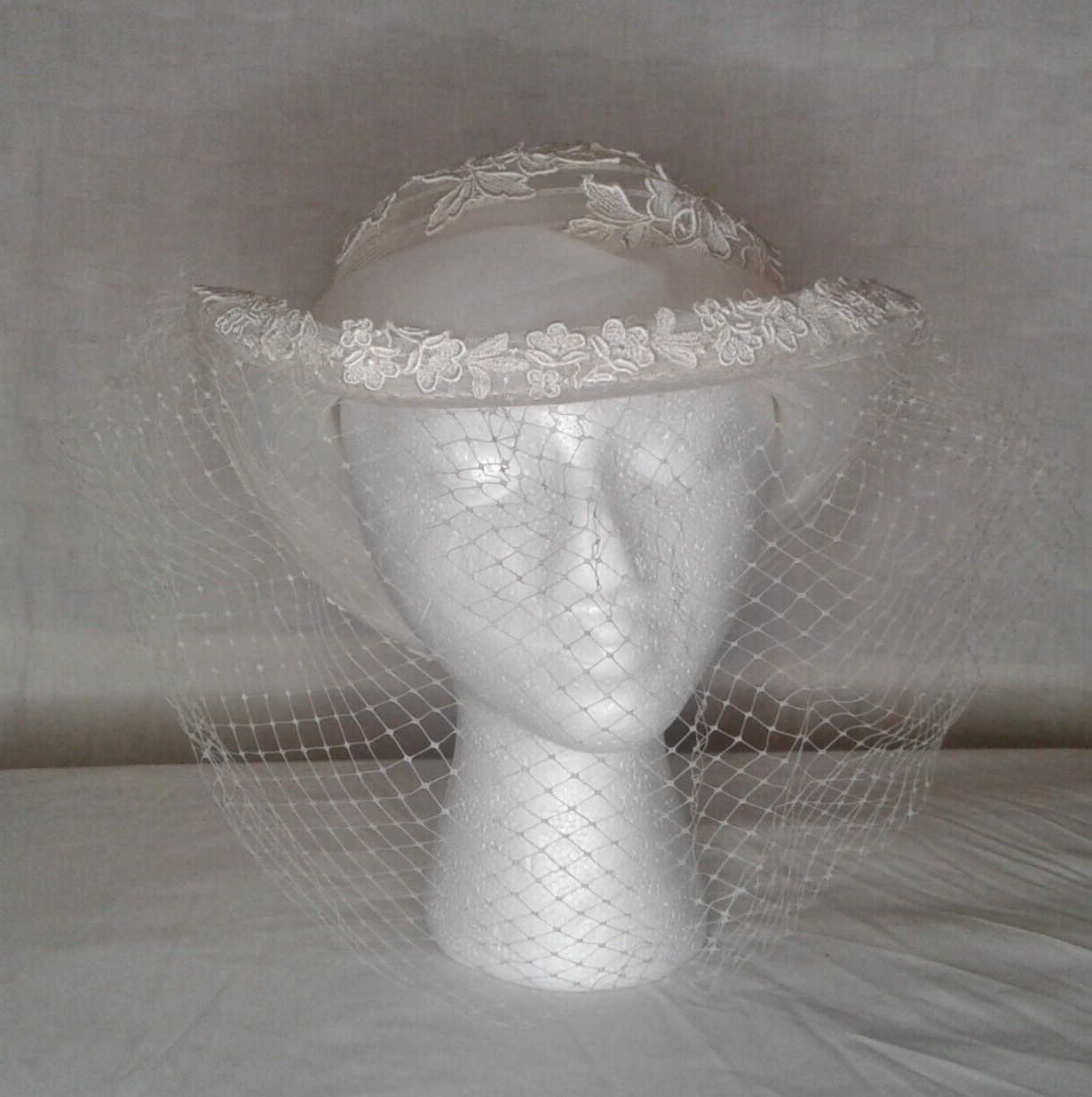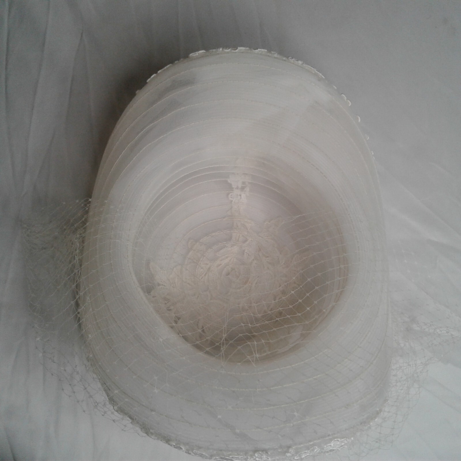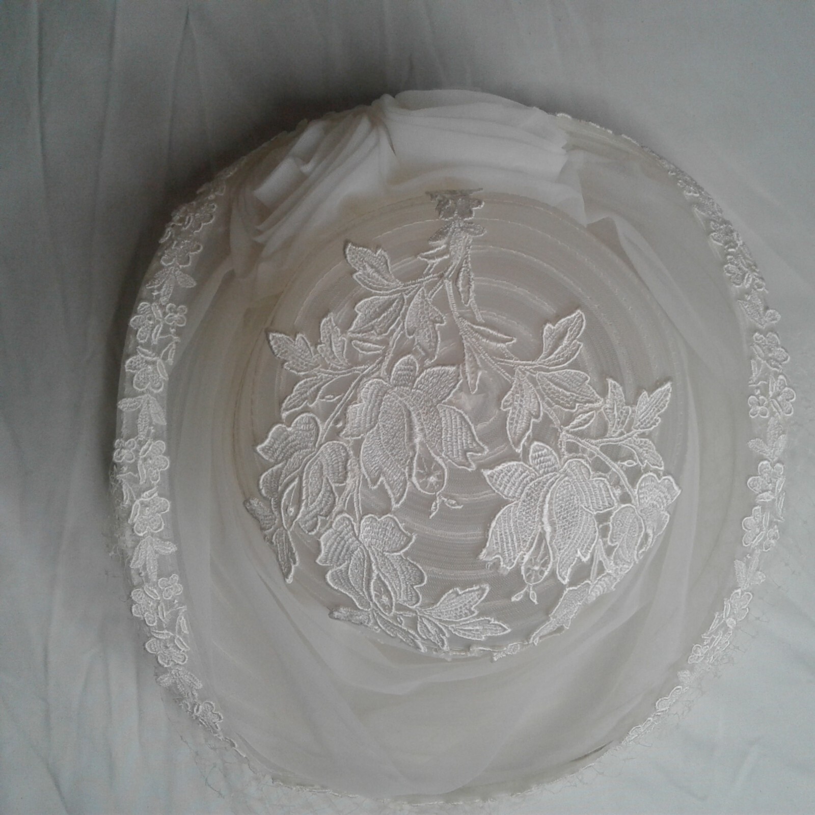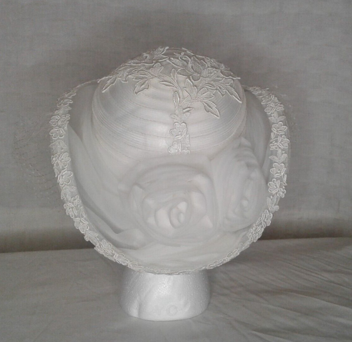 White Wedding Hat with Veil Flowers Lace measurement 20 1/2in inside hat round