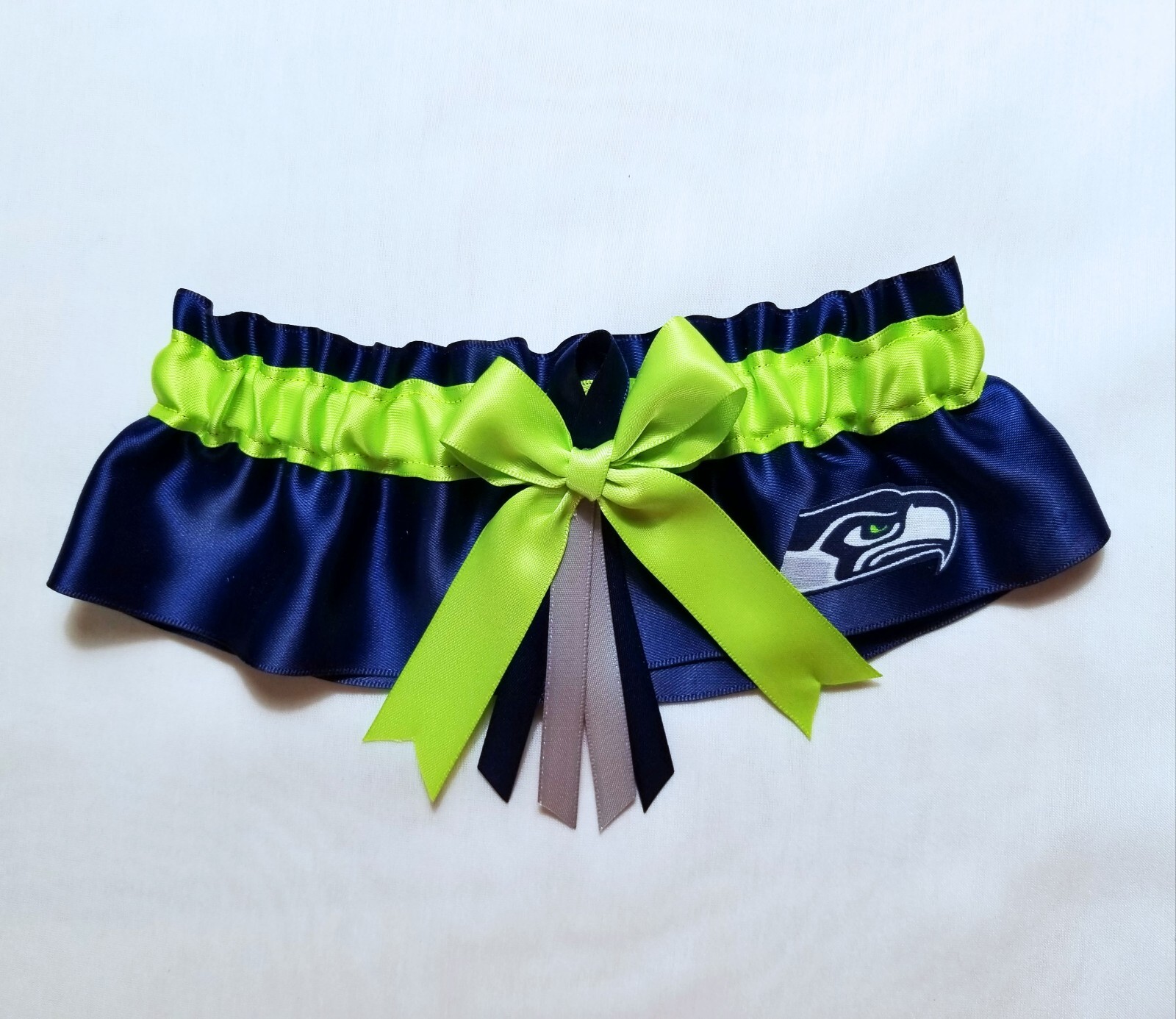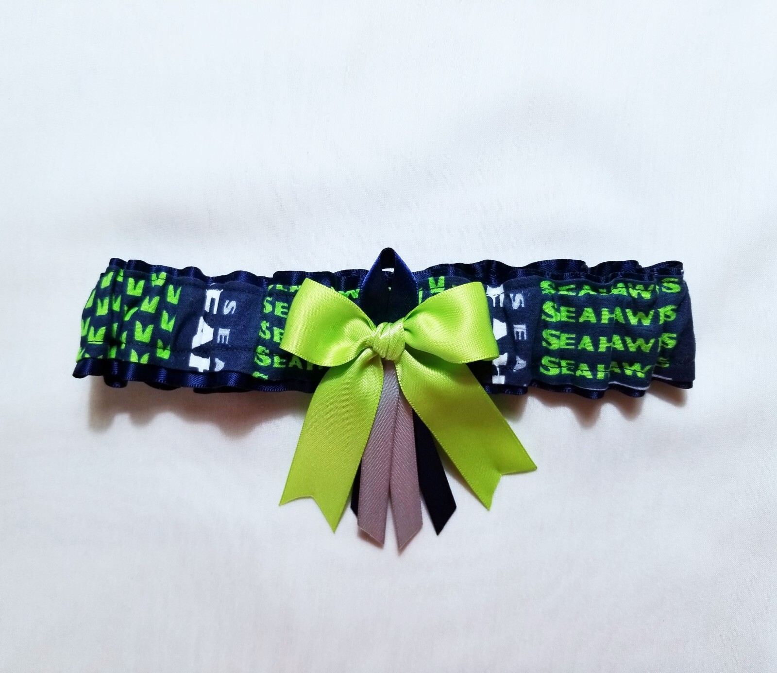 Navy Satin Seahawks Fabric, Leg Wedding/Prom Garter Set, Over Sized Bow, 19-22
