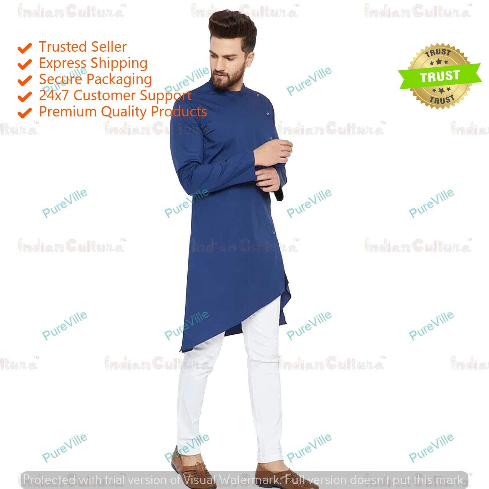 Mens Shirt Kurta Cotton Fabric Indian Dress Mens Tunic Kurta Plain Color Blue