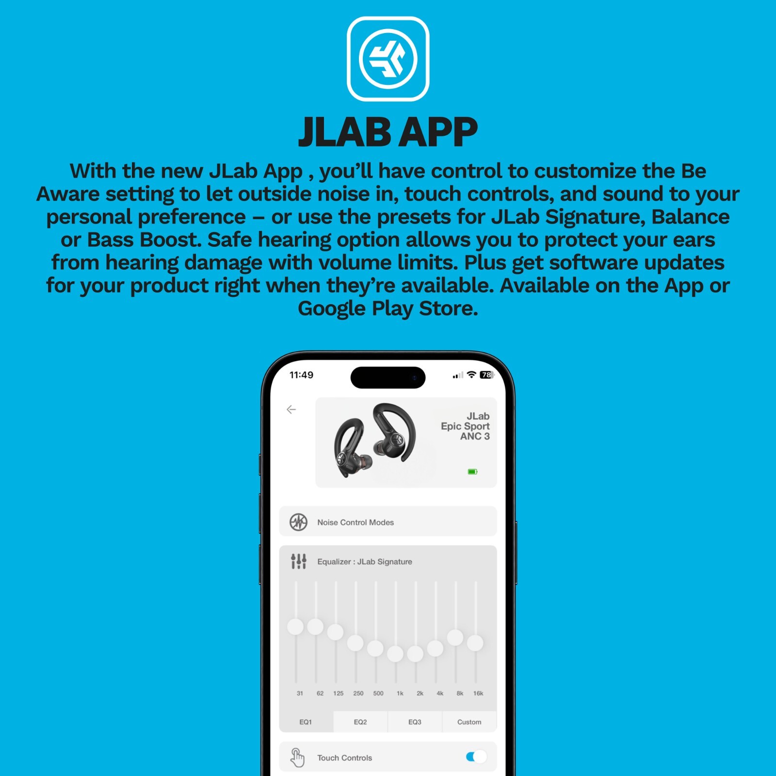 JLab Epic Sport ANC 3 True Wireless Earbuds, Sport EarHook, Android/iOS