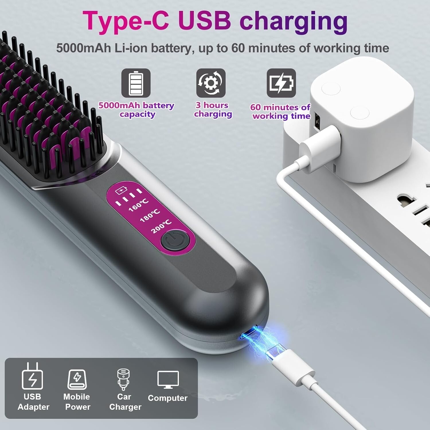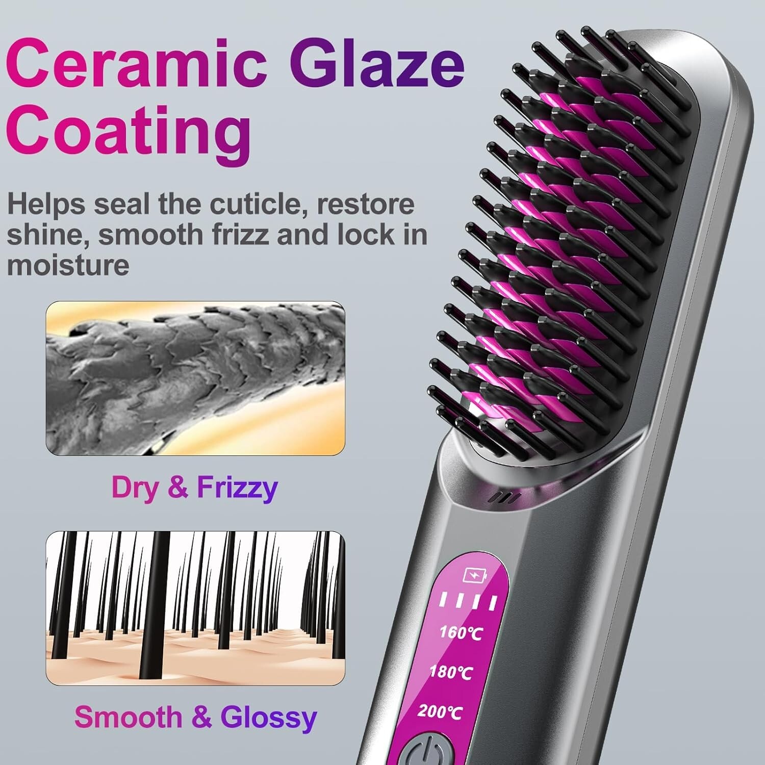 Cordless Hair Straightener Brush Ion Heated Straightening Comb USB Rechargeable