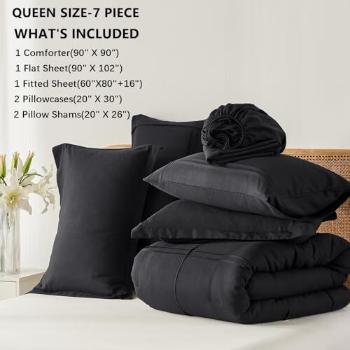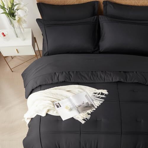 Queen Comforter Set 7 Piece Bed in a Bag,Grid Pinch 7Piece-Queen 90X90 Black