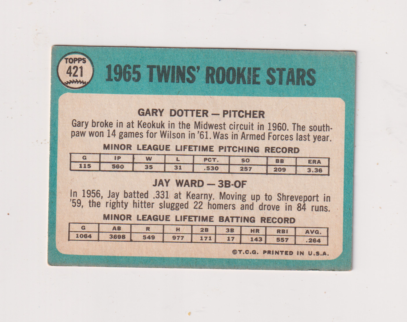 1965 Topps 421 Twins Rookies G. Dotter / J. Ward. EX