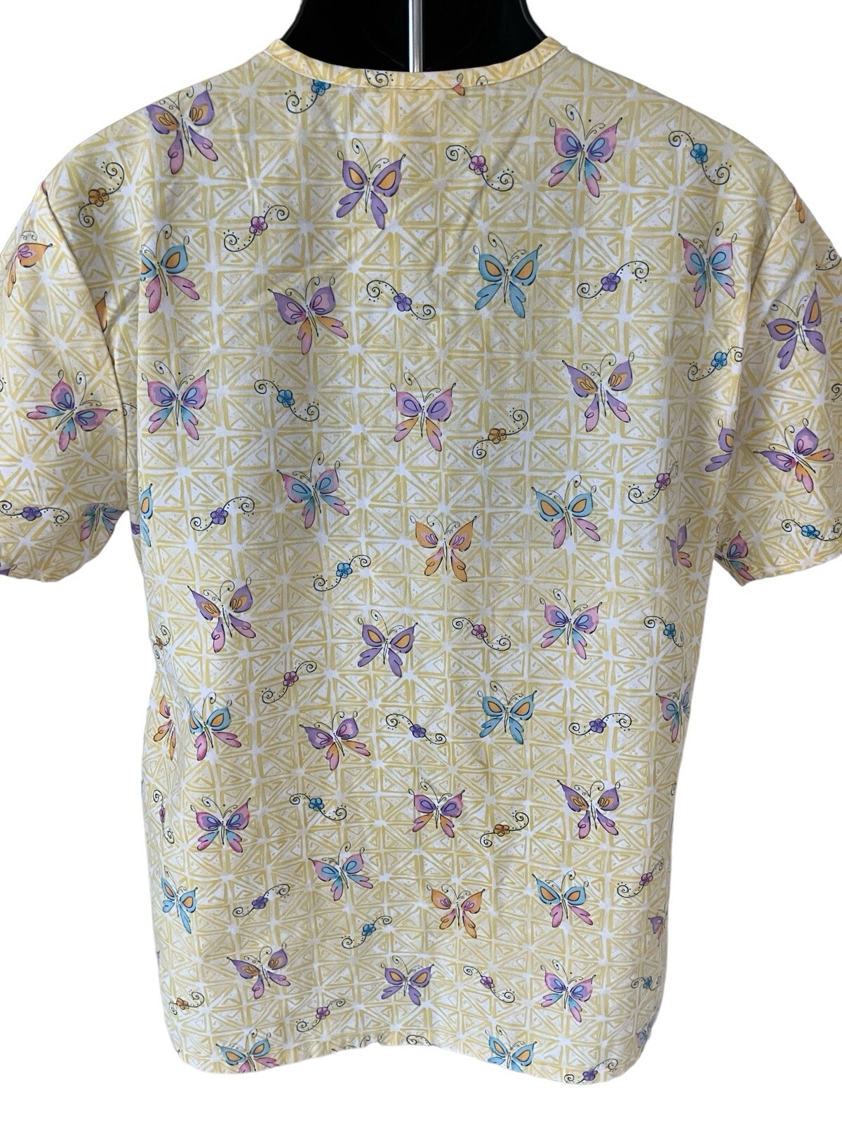SB Scrubs Top Women's Medium Yellow Multicolor Butterfly V-Neck Short Sleeve