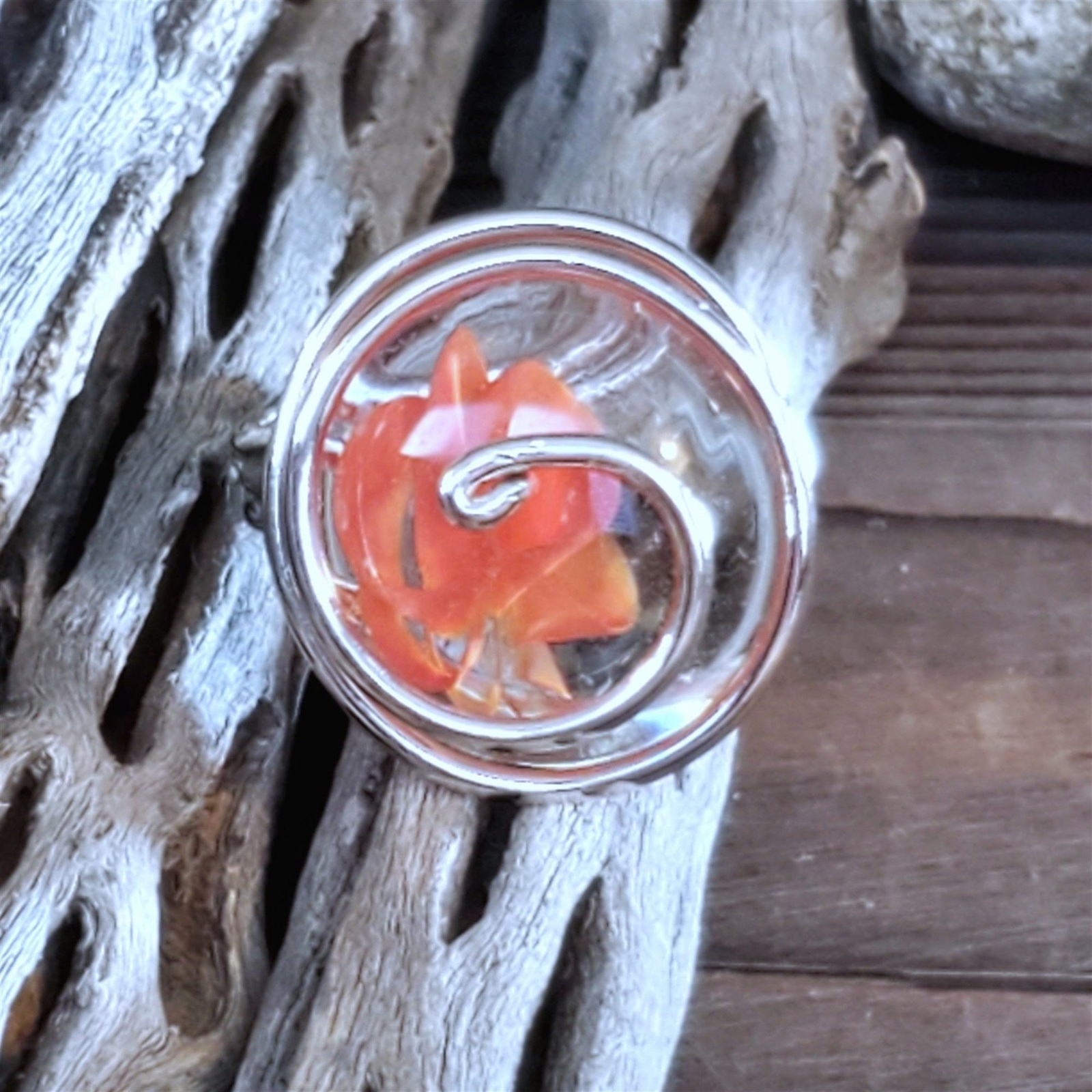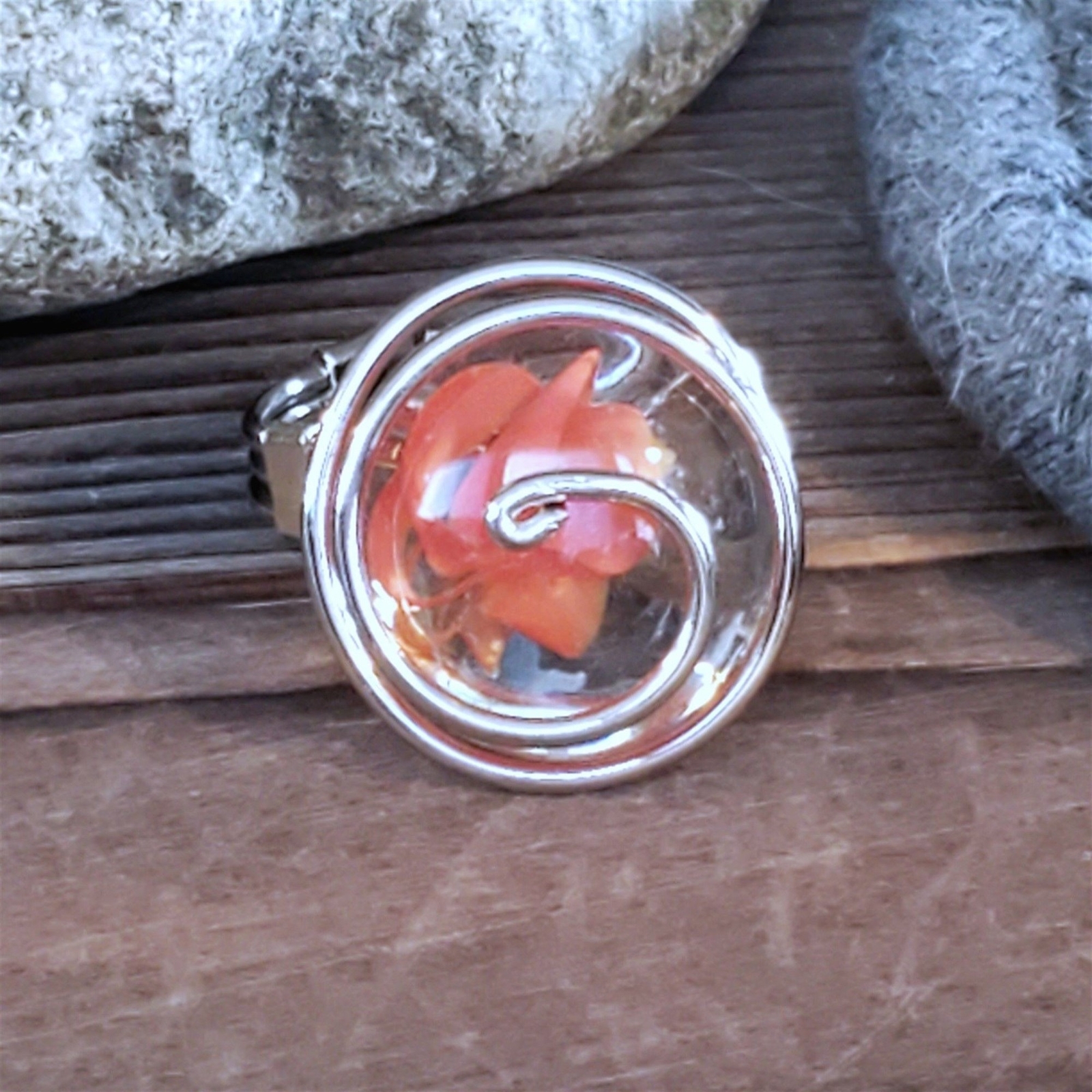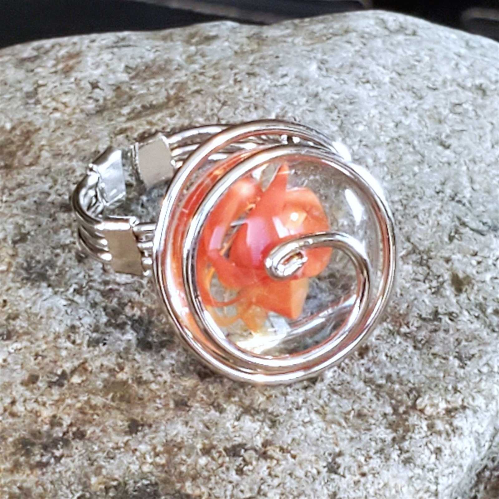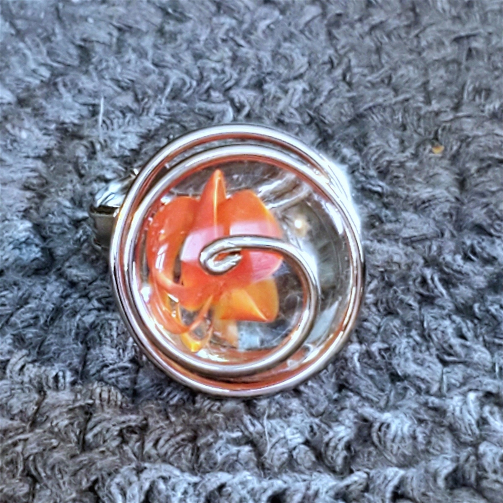 Handcrafted Edgy Clear Orange Red Spiral Silver Spiral Luster Glass Bauble Ring