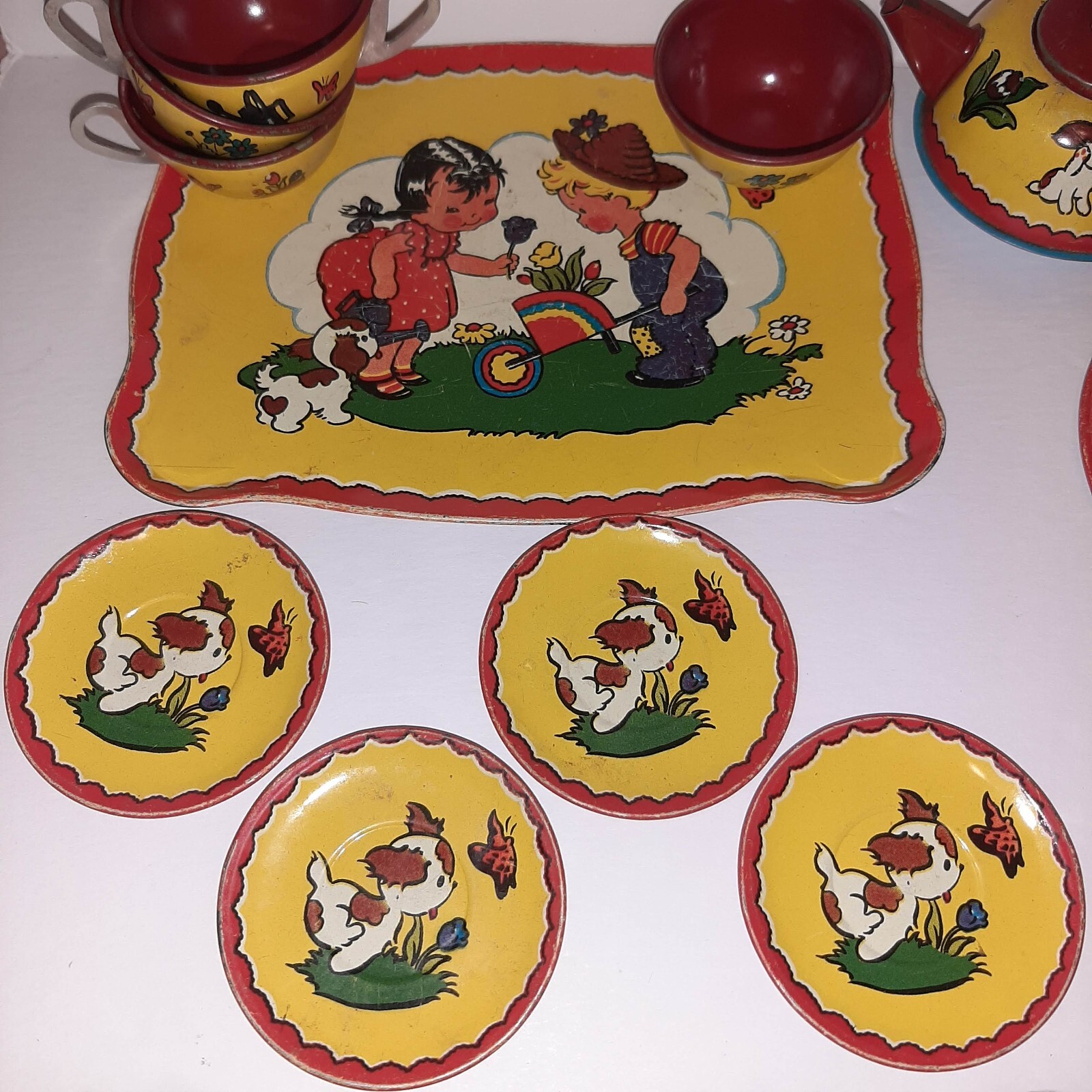 Vintage 15 Piece Tin Litho Tea Set Ohio Art Puppy Girl Teapot Cups Plates Tray