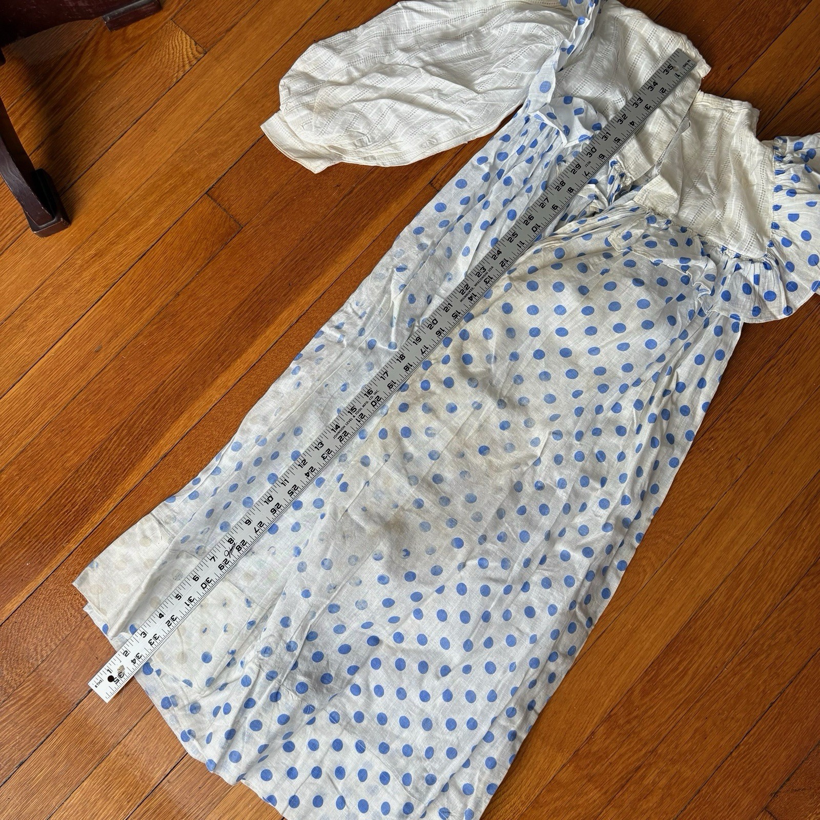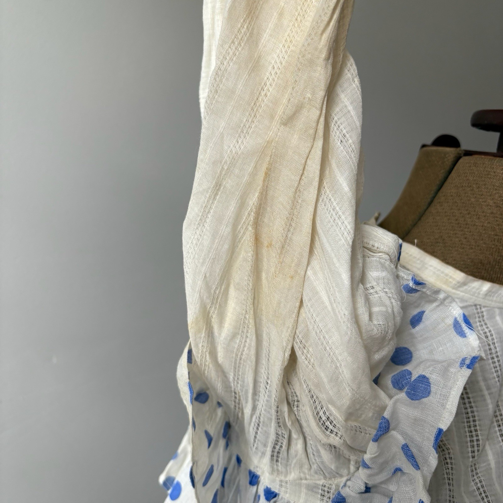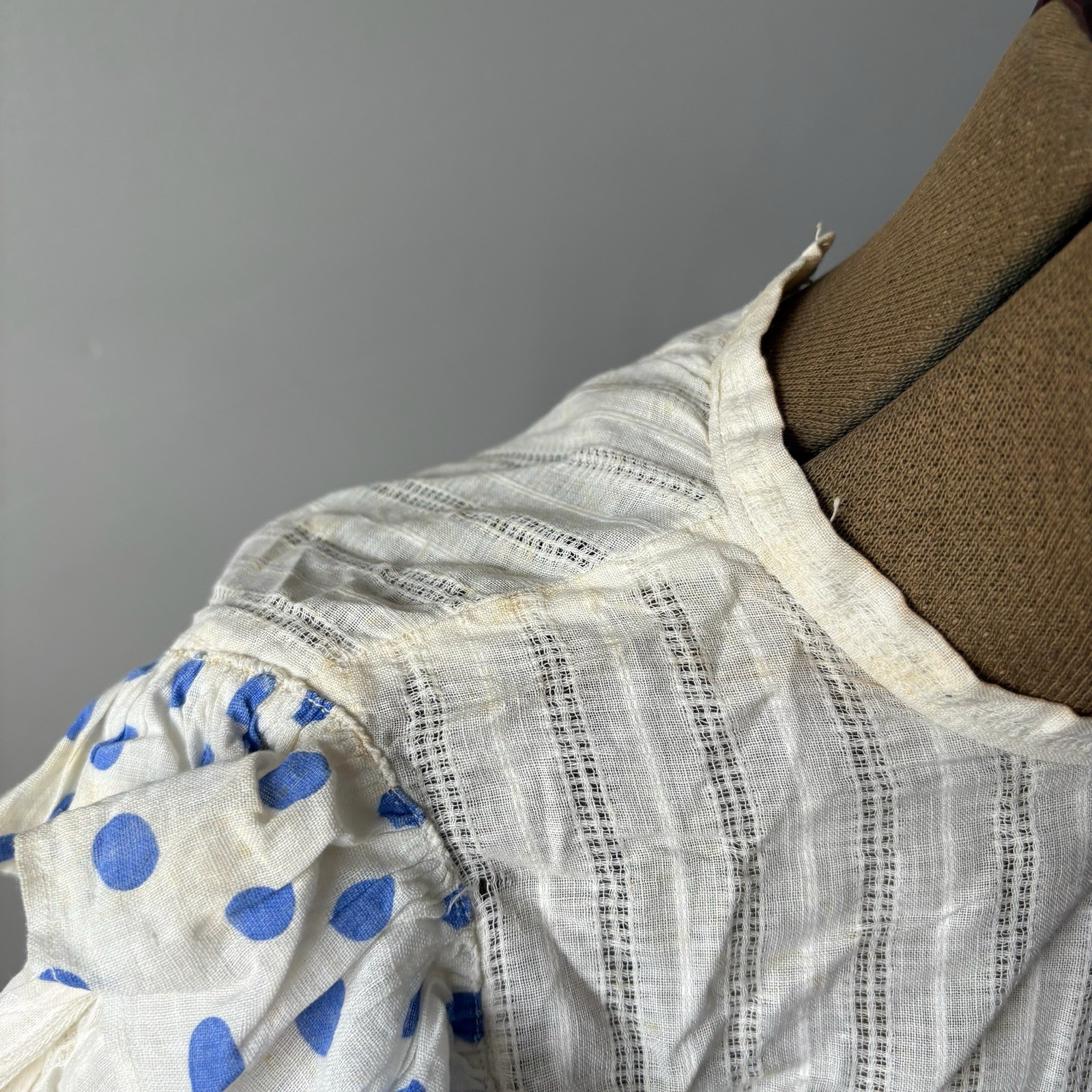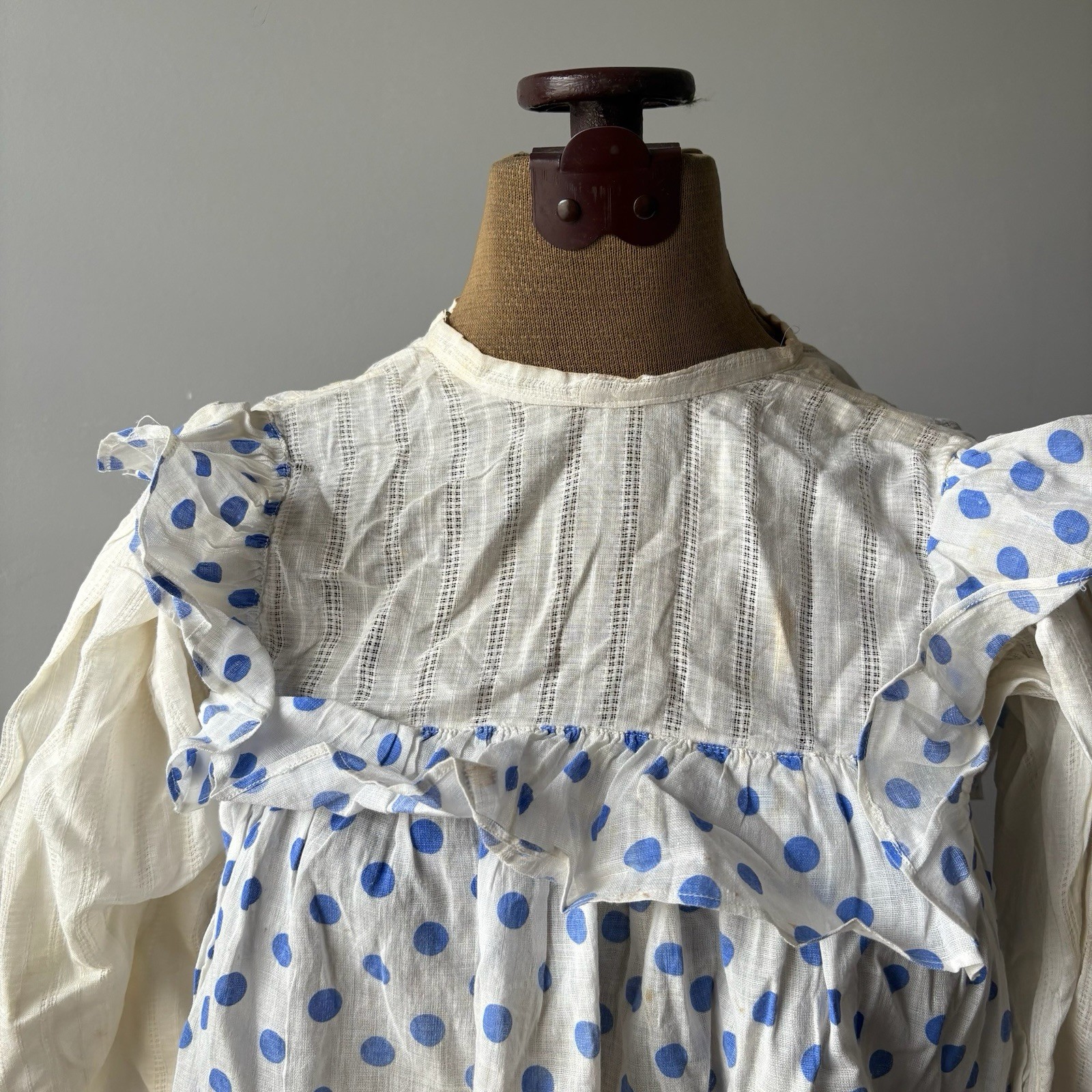как выглядит Antique Blue And White Polka Dot Youth Dress As Is Worn Flaws Cute фото