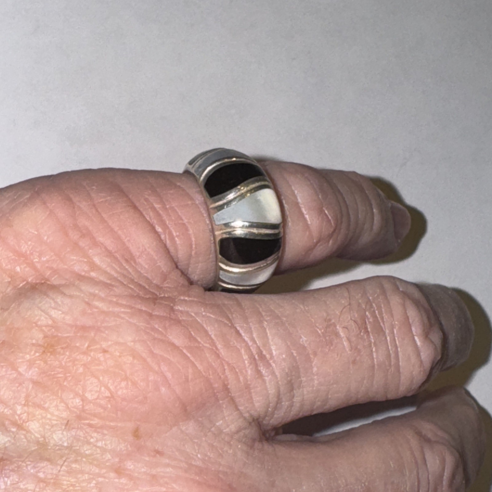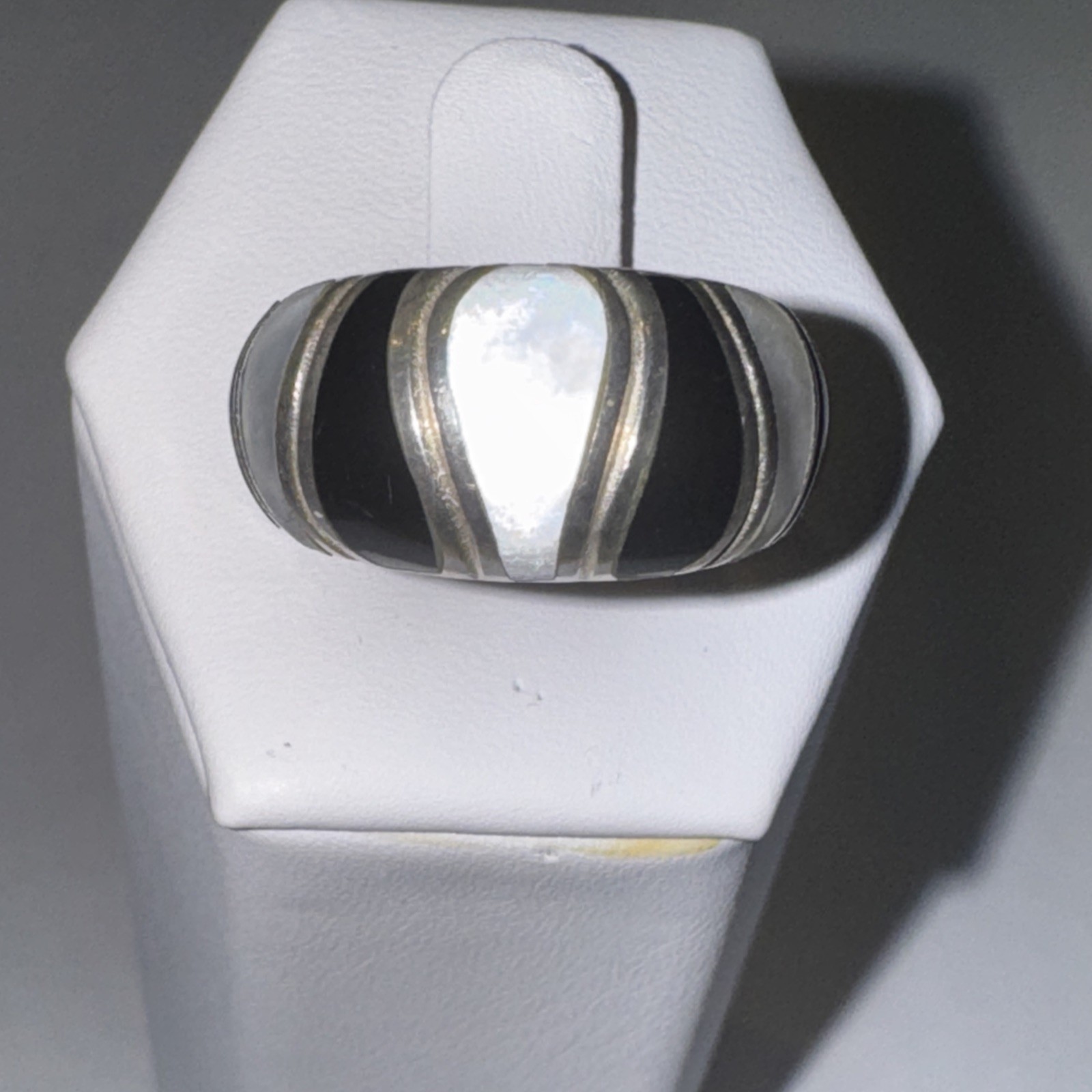Vintage Sterling Silver Mother Of Pearl and Black Onyx Ring 7.5
