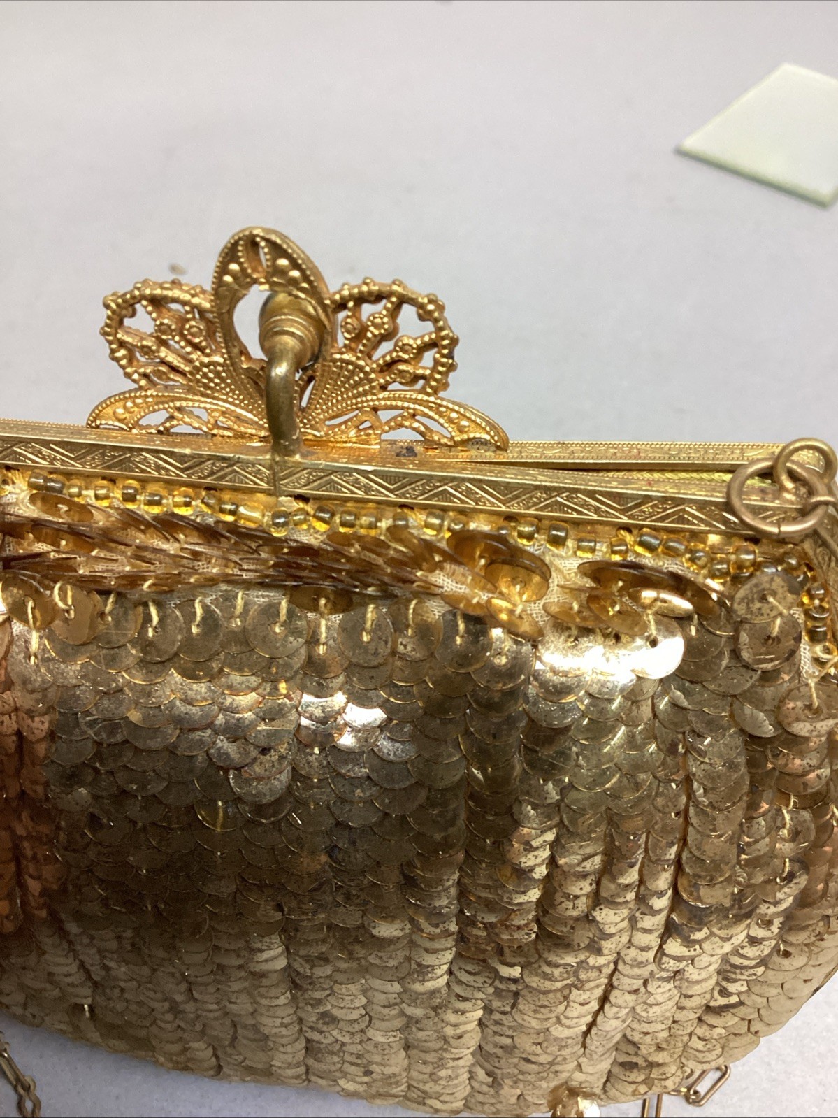 Antique Women s Gold Sequin Mesh Change Purse With Shoulder Strap Mirror