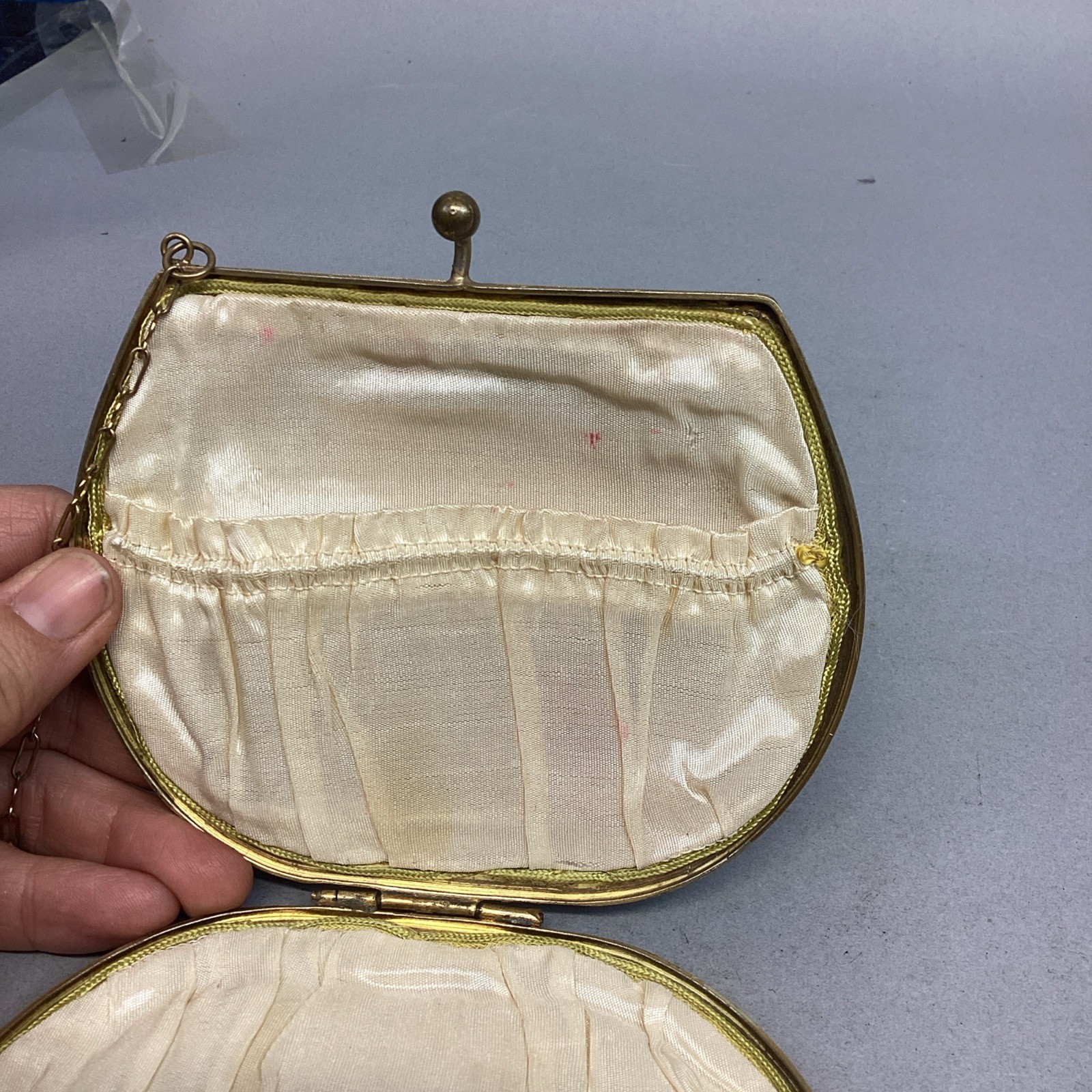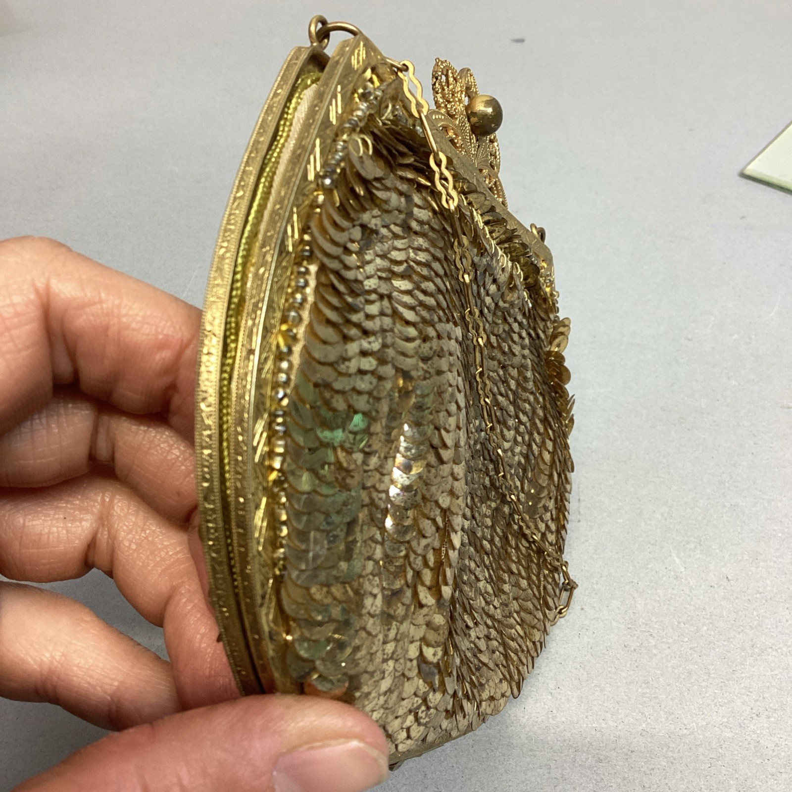 как выглядит Antique Women s Gold Sequin Mesh Change Purse With Shoulder Strap Mirror фото