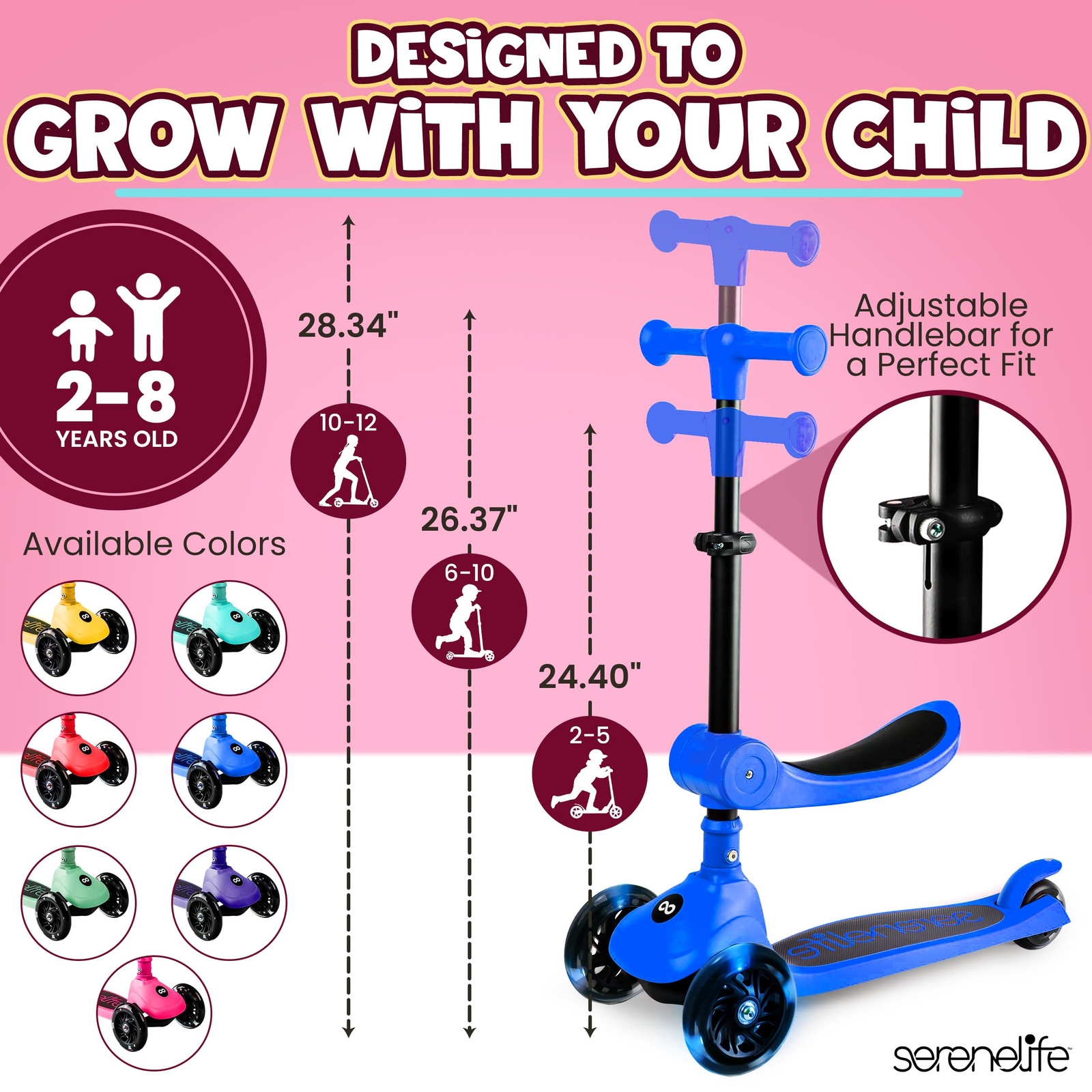 SereneLife 3-Wheel Foldable Kids LED Scooter w/Adjustable Handlebar Blue