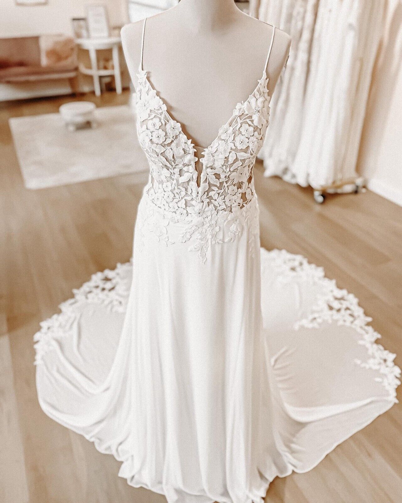 Crepe Plunging Lace Wedding Dress Bridal Gown Custom made Cut-out-train Ivory