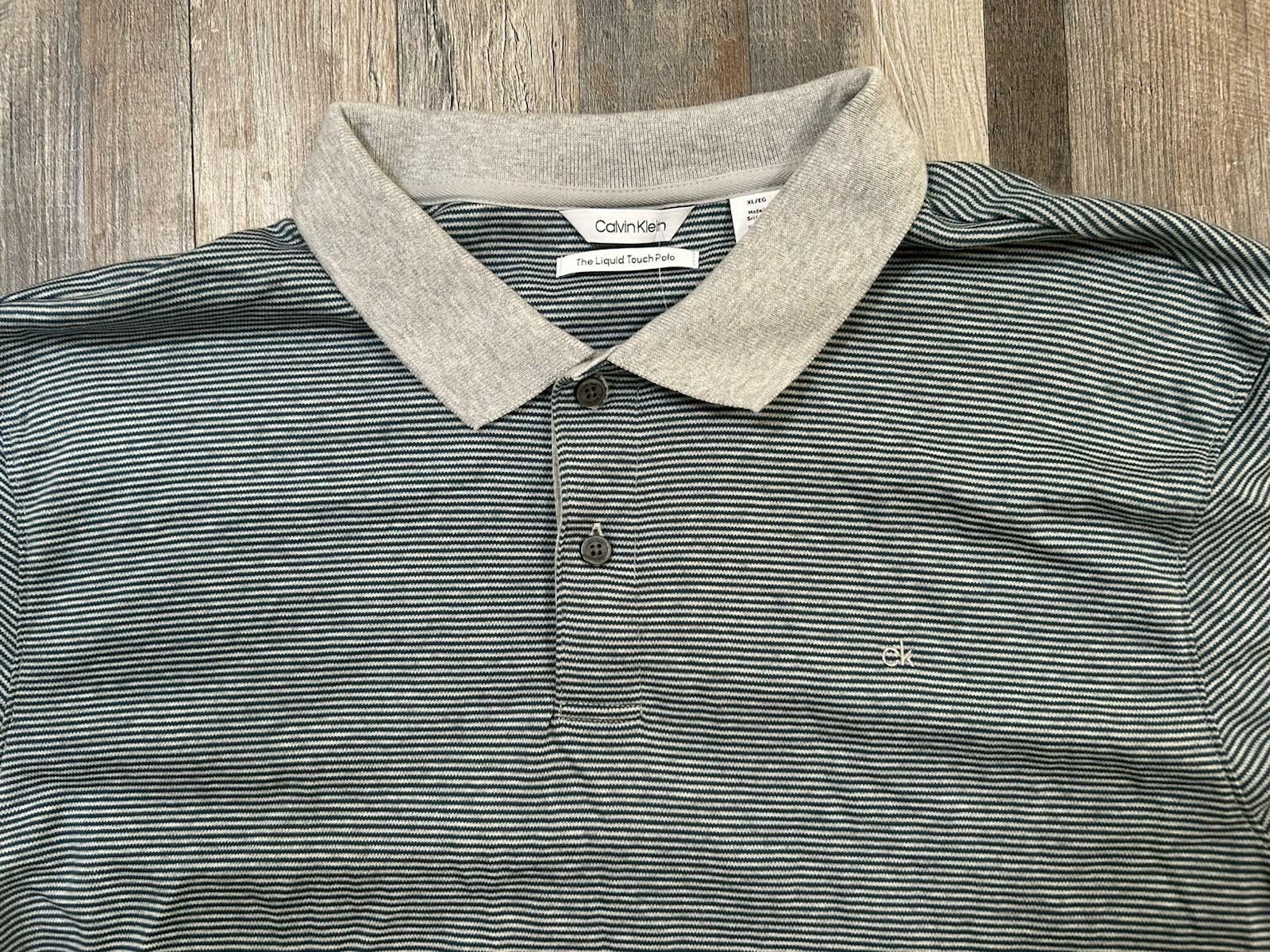 как выглядит Calvin Klein Liquid Touch Mens Size XL Gray Striped Short Sleeve Polo Shirt NWOT фото