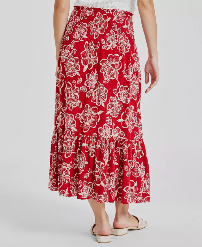 Nautica Jeans Women's Red Siesta Floral Smocked-Waist MIDI Skirt Size XL