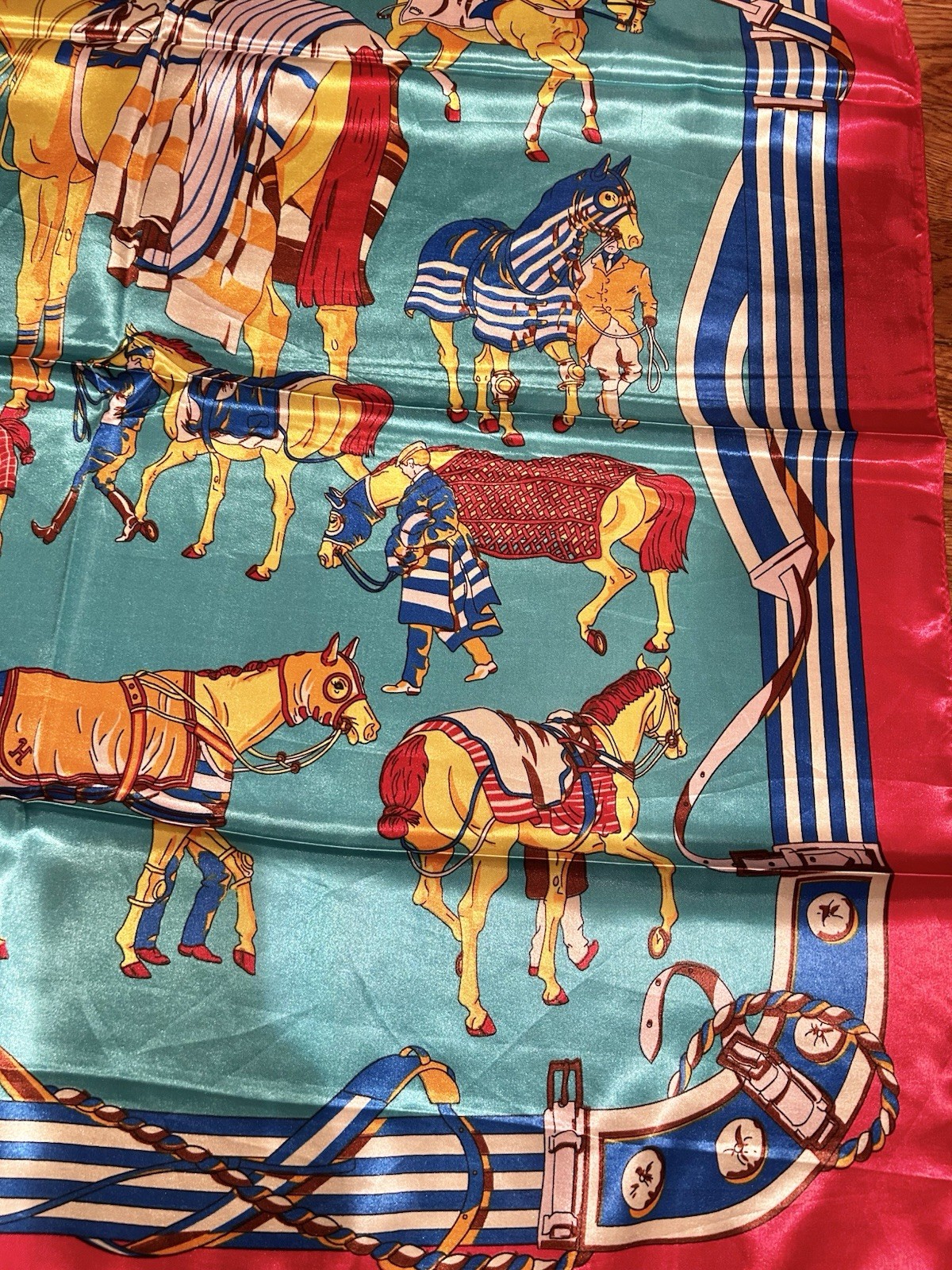 как выглядит Vintage classic EQUESTRIAN horses PRINT TURQUOISE/Fuchsia SQUAR SILK SCARF 35/35 фото