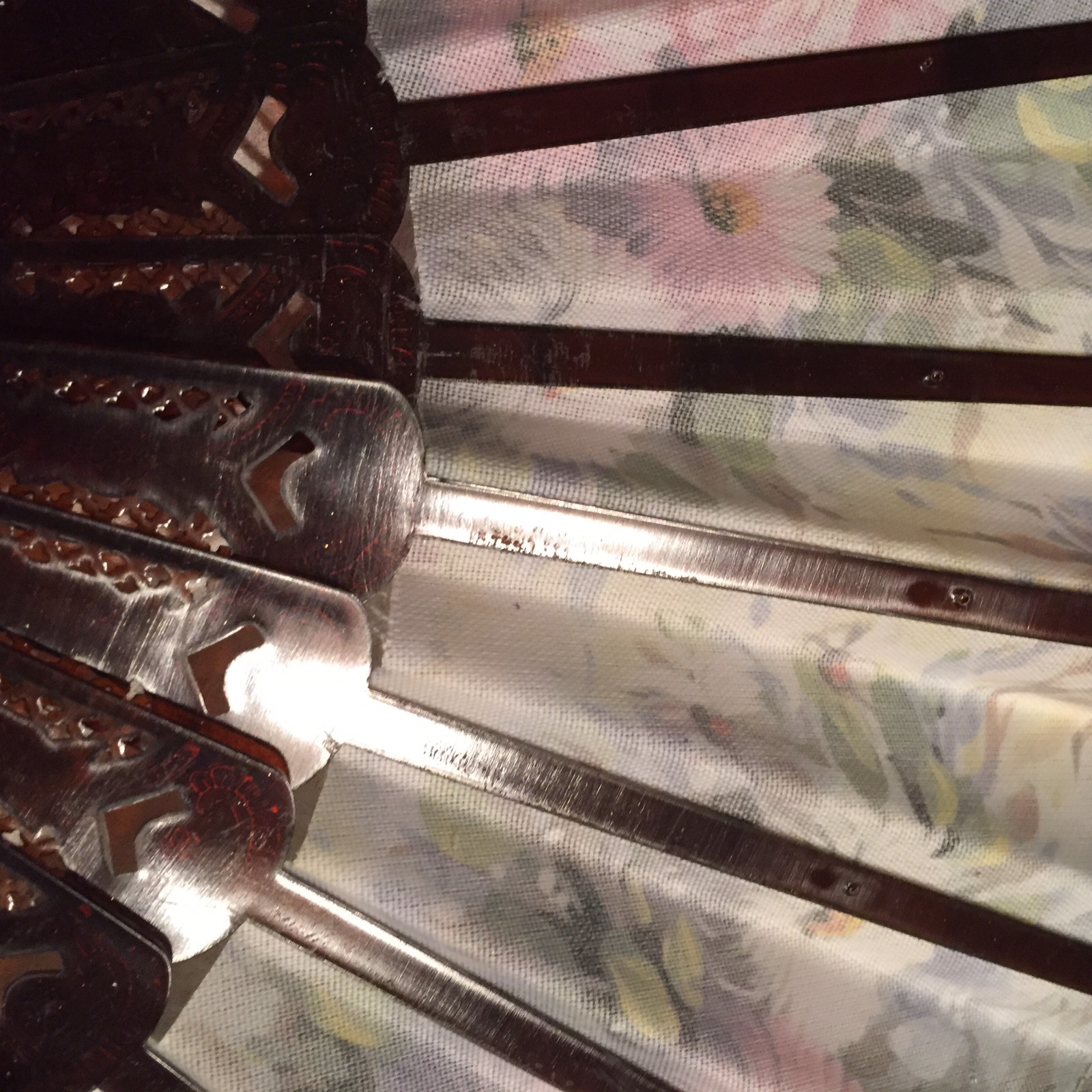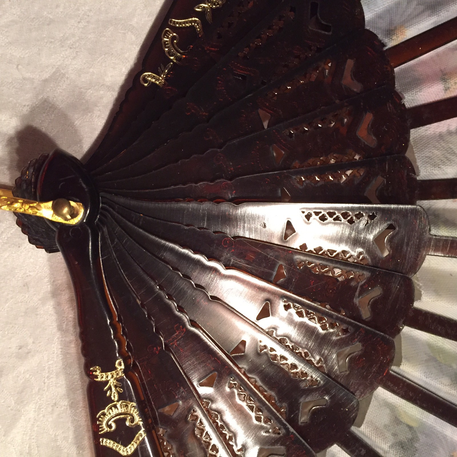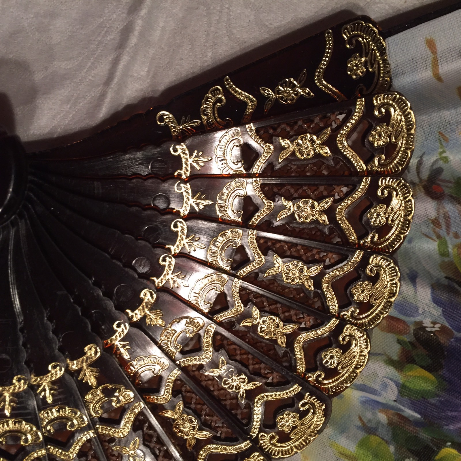 как выглядит Vtg Folding 9" Fan Faux Tortoise Frame Flower Detail Signed W/gold Accent фото