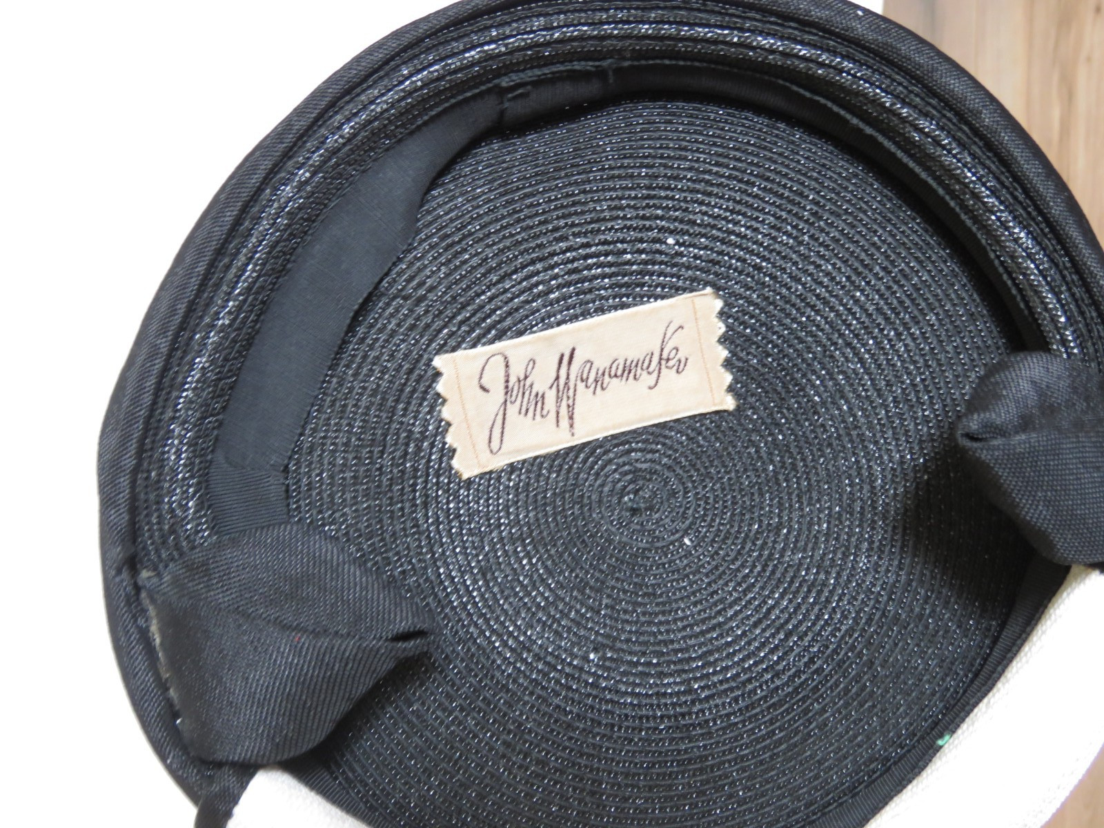 как выглядит VTG 1950s John Wanamaker Small Black Cream Straw Raffia Pillbox Hat 8" Diam фото
