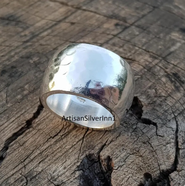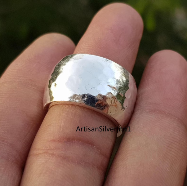 как выглядит 925 Sterling Silver Ring, Wide Band Ring, Handmade Ring, Hammered Dome ALL Size фото