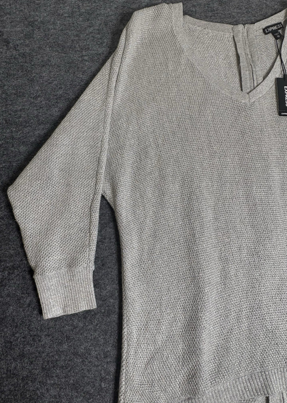 как выглядит New With Tag Express Woman s Gray Sparkle Cotton Knit Sweater Size XS 3/4 Sleeve фото