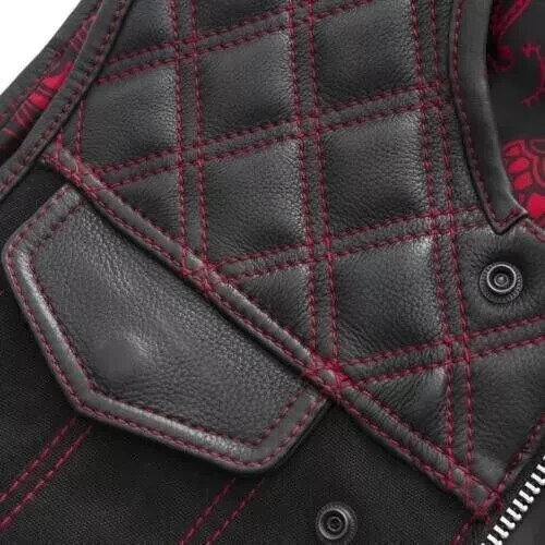 Men's Black Leather Biker Hunt Club Vest Red Diamond Concealed Waistcoat