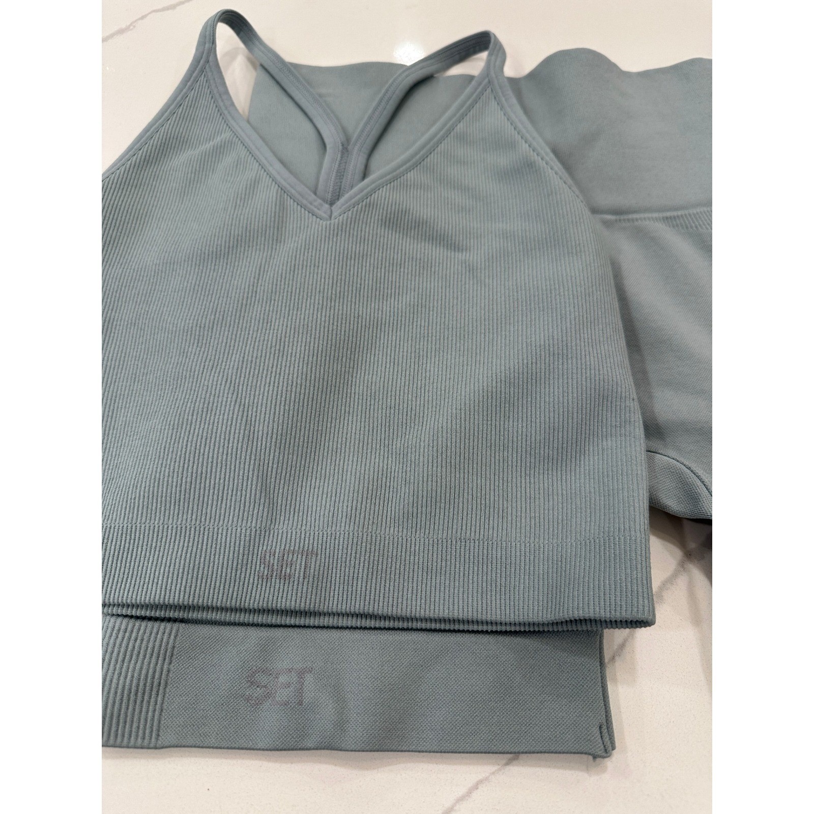 как выглядит SET ACTIVE Ribbed Seamless Bra Top Sculptflex Shorts Set Athletic Blue S/M фото
