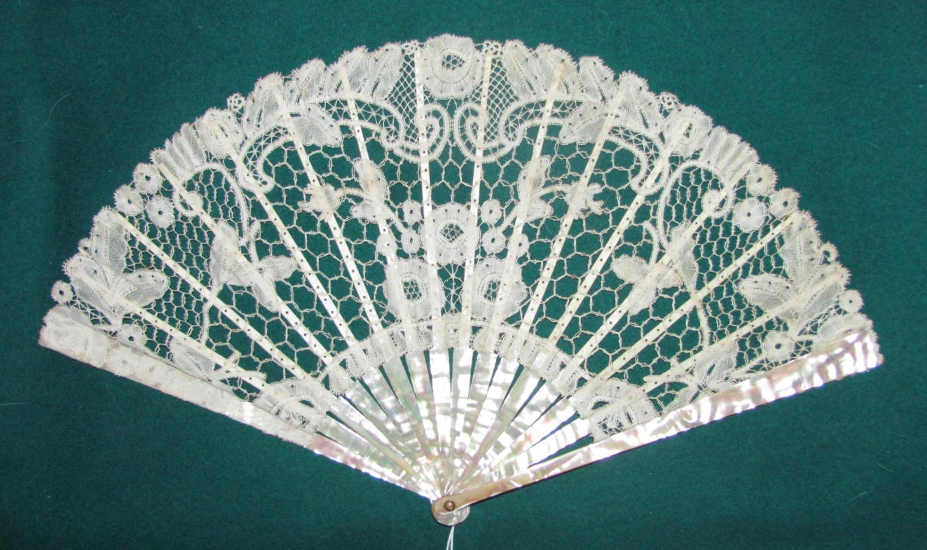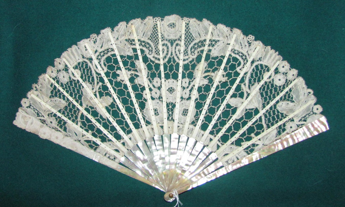 как выглядит Antique Edwardian Handmade Honiton Lace Fan Mother of Pearl Sticks Circa 1910 фото