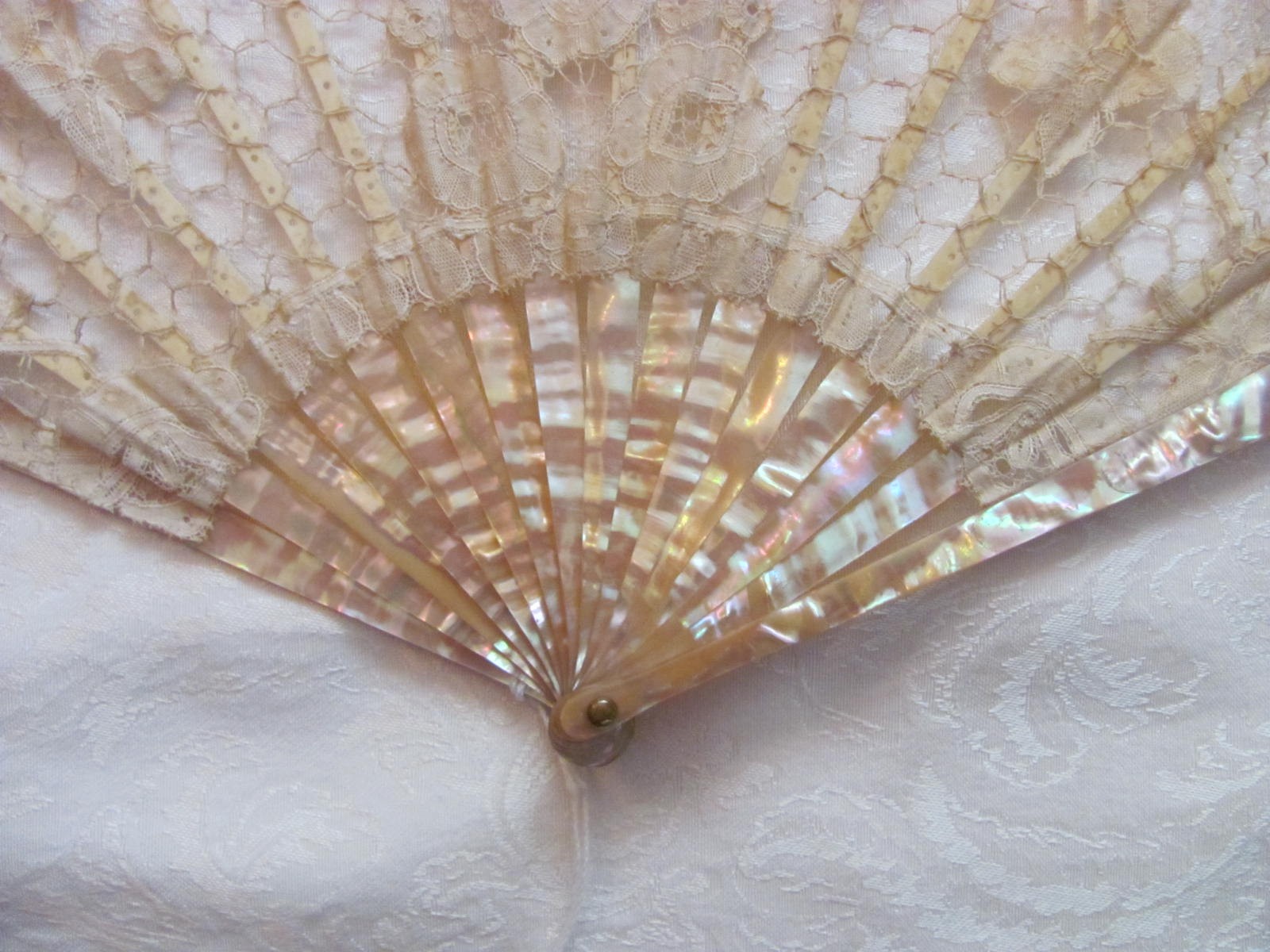 Antique Edwardian Handmade Honiton Lace Fan Mother of Pearl Sticks Circa 1910