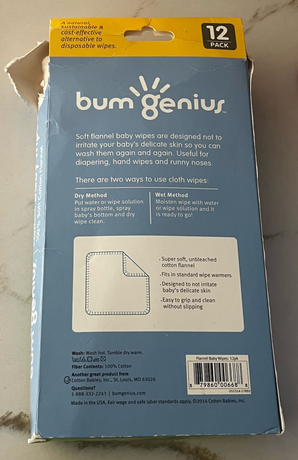 Bum Genius Reusable Baby Wipes 12 Pack 100 Soft Cotton Flannel Unbleached