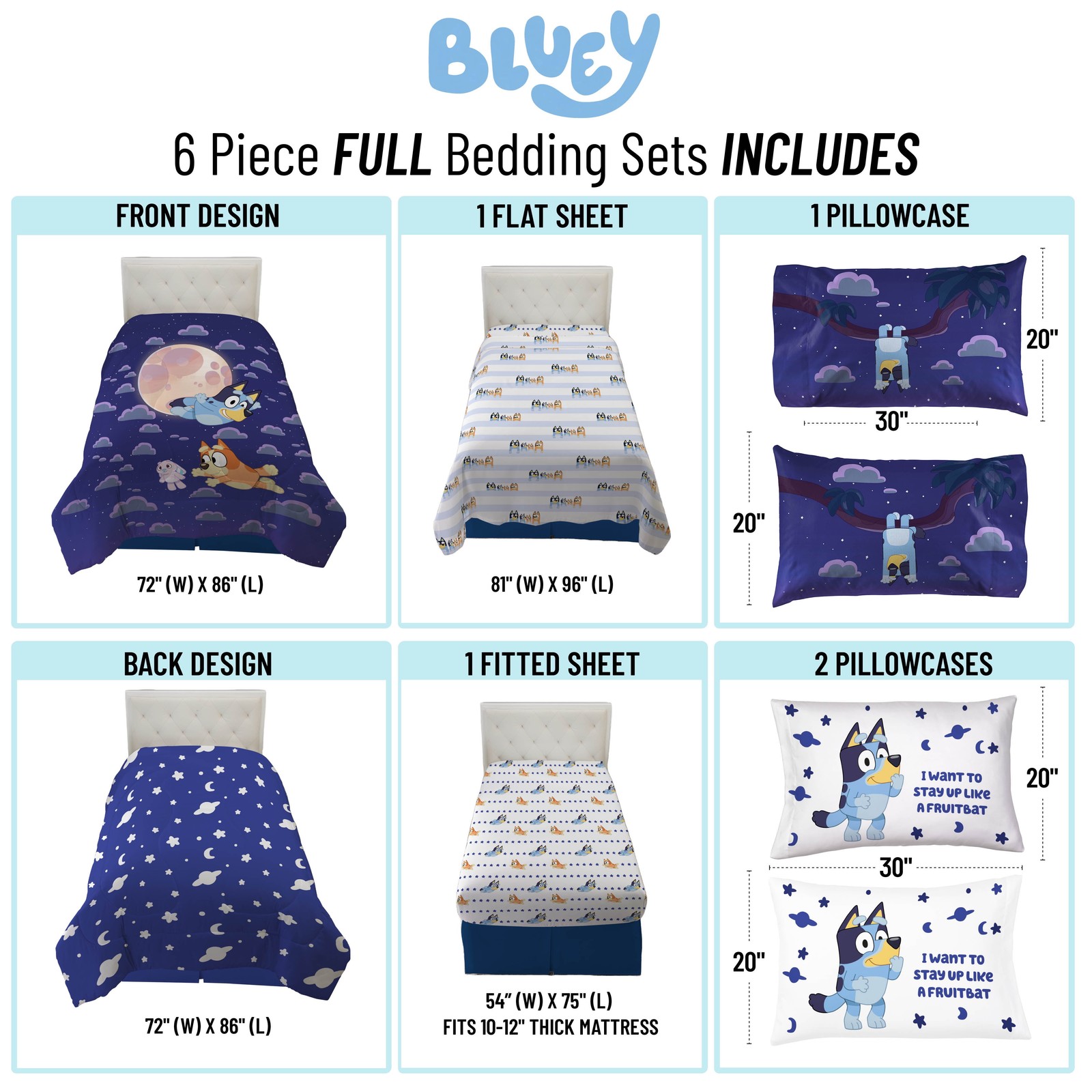 BBC Studios Bluey Blue 7 Piece Full Bed Set W/ Sham, 100 Microfiber