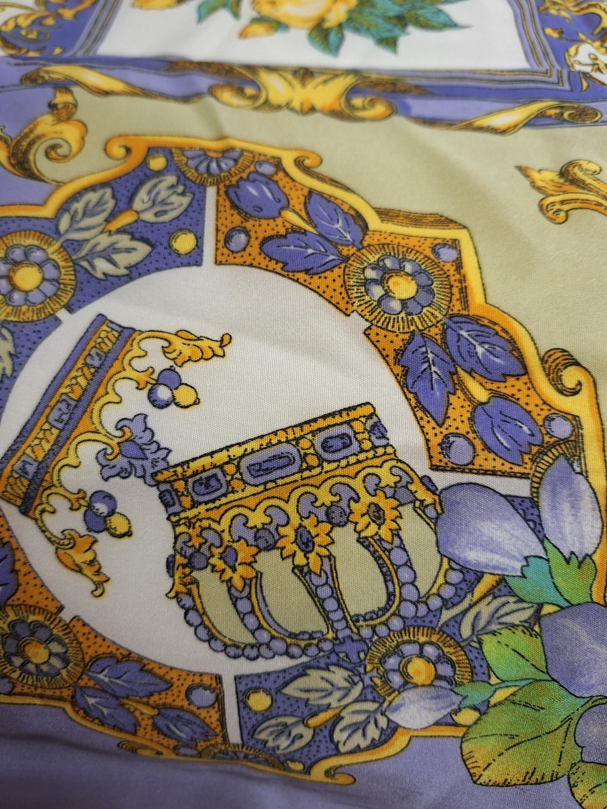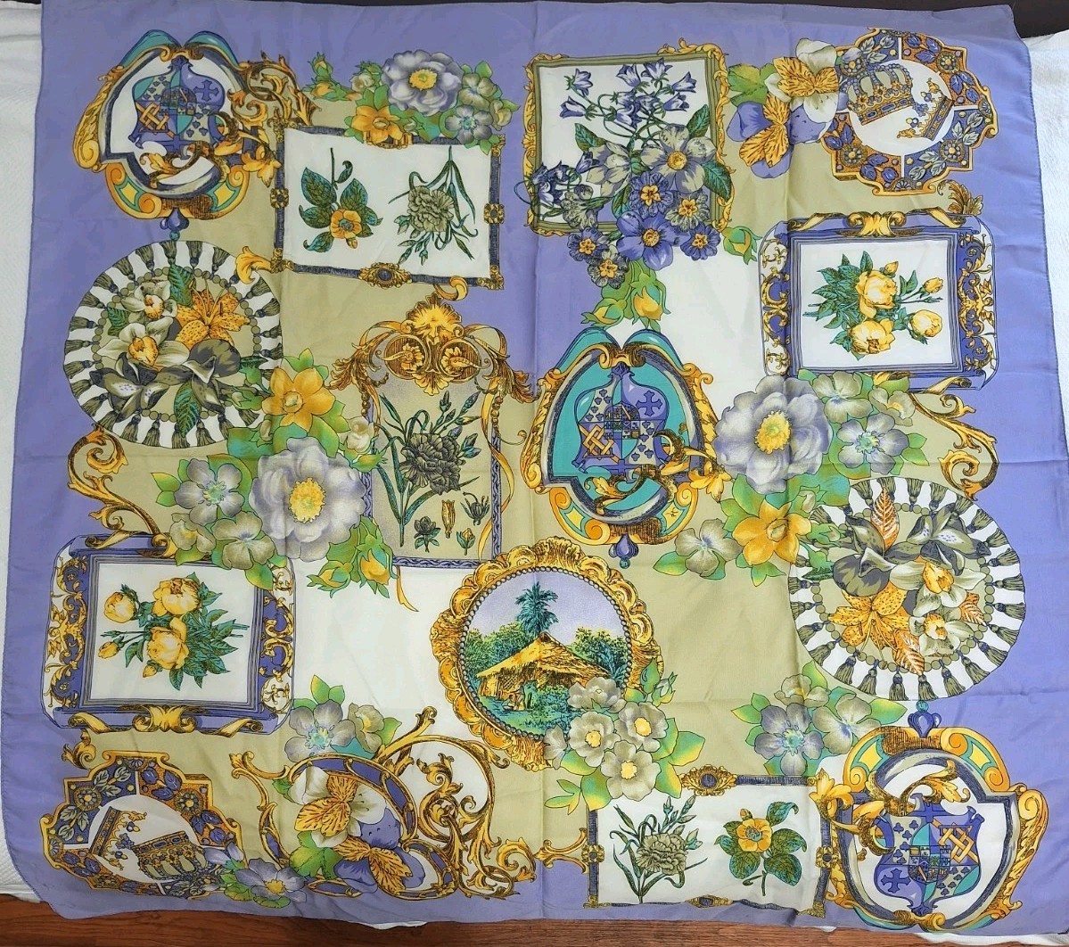 как выглядит Vtg Lg Polyester Scarf SOUVENIR Floral TIKI HUT HAWAIIAN Coat Of ARMS LAVENDER фото