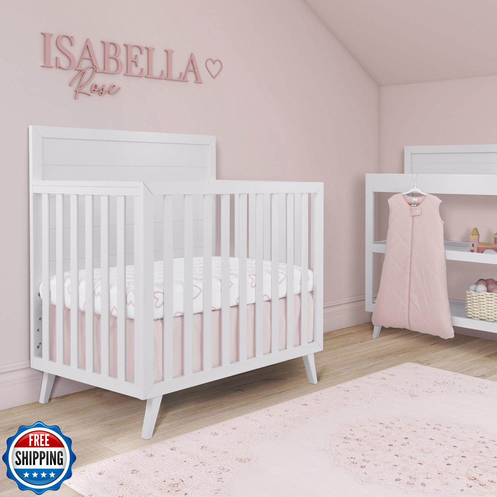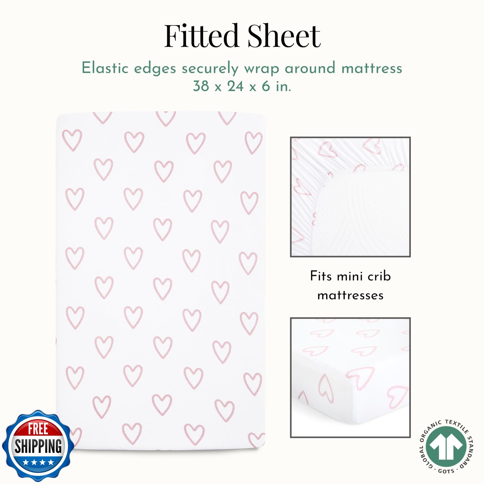 Evolur Baby Pink and Heart Print 3 Piece Mini Crib Bedding Set, Machine Washa