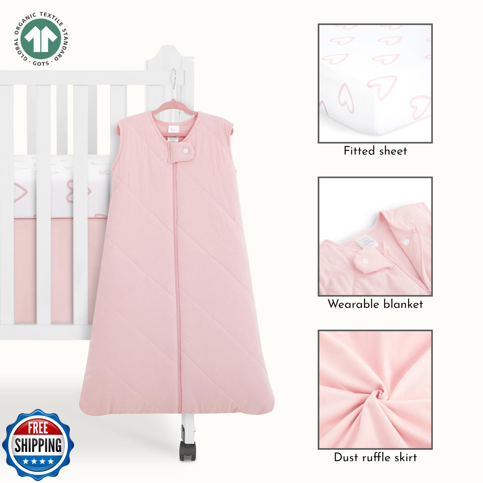 как выглядит Evolur Baby Pink and Heart Print 3 Piece Mini Crib Bedding Set, Machine Washa фото