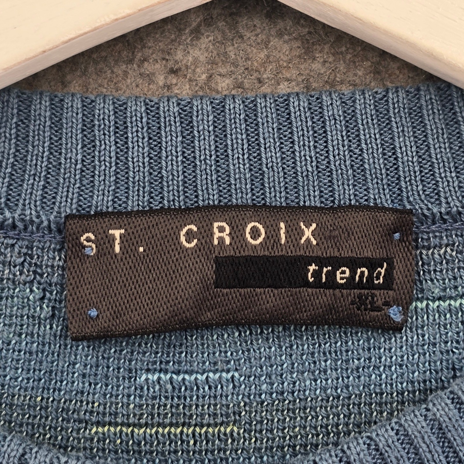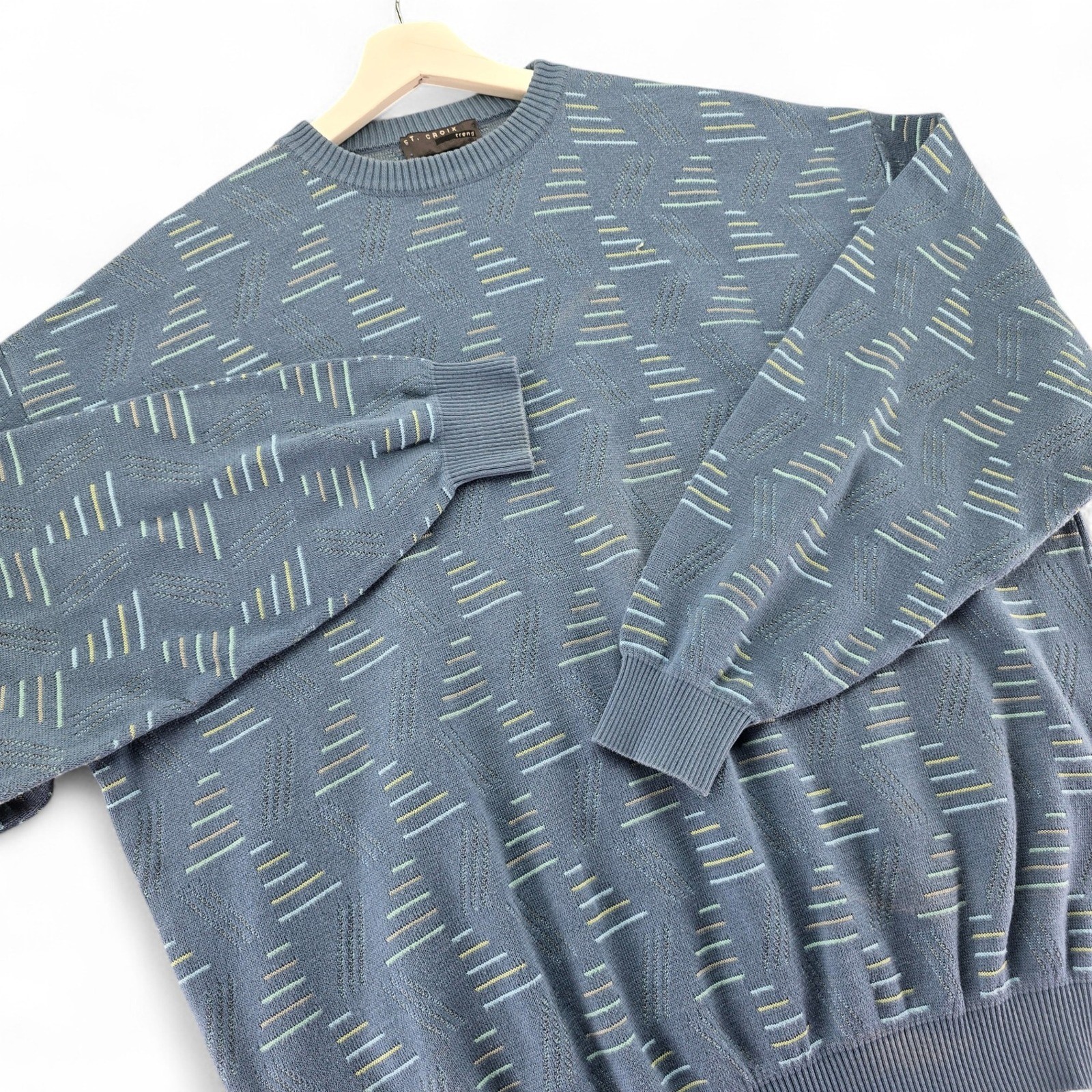 как выглядит St. Croix Trend Geometric Knit Sweater Mens XL Blue Retro Crew Neck Pullover фото
