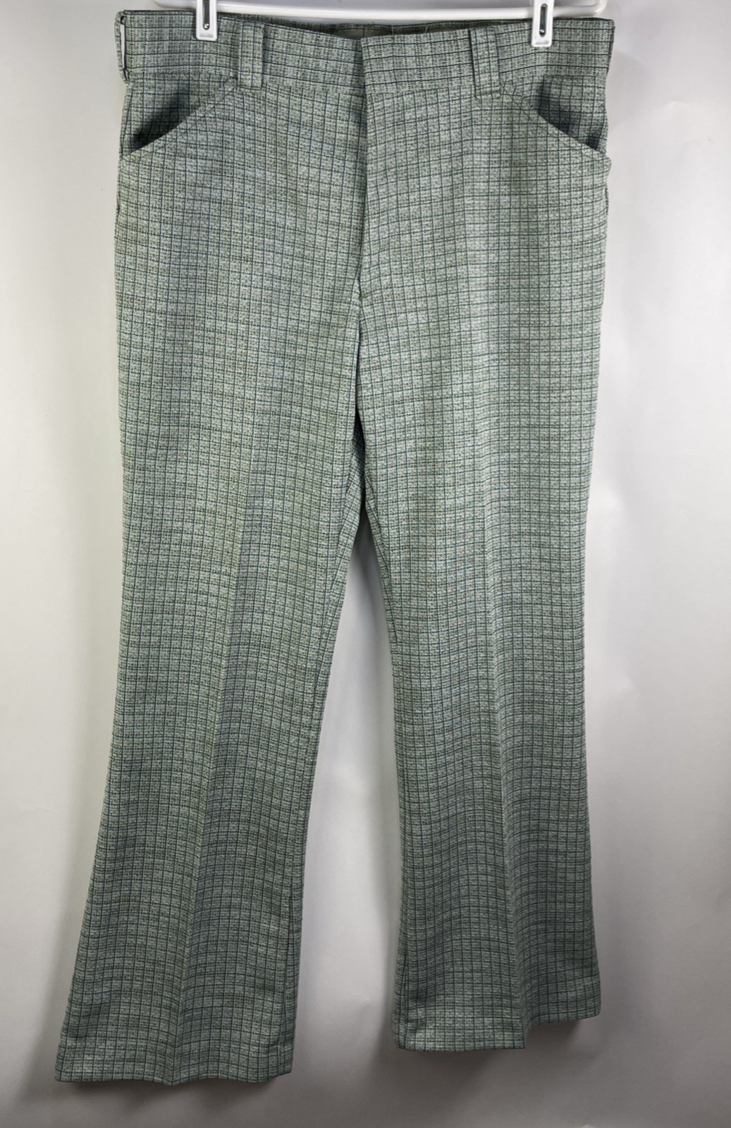 VTG 70s Plaid Double Knit Polyester Flare Pants Mens 37x30 Green