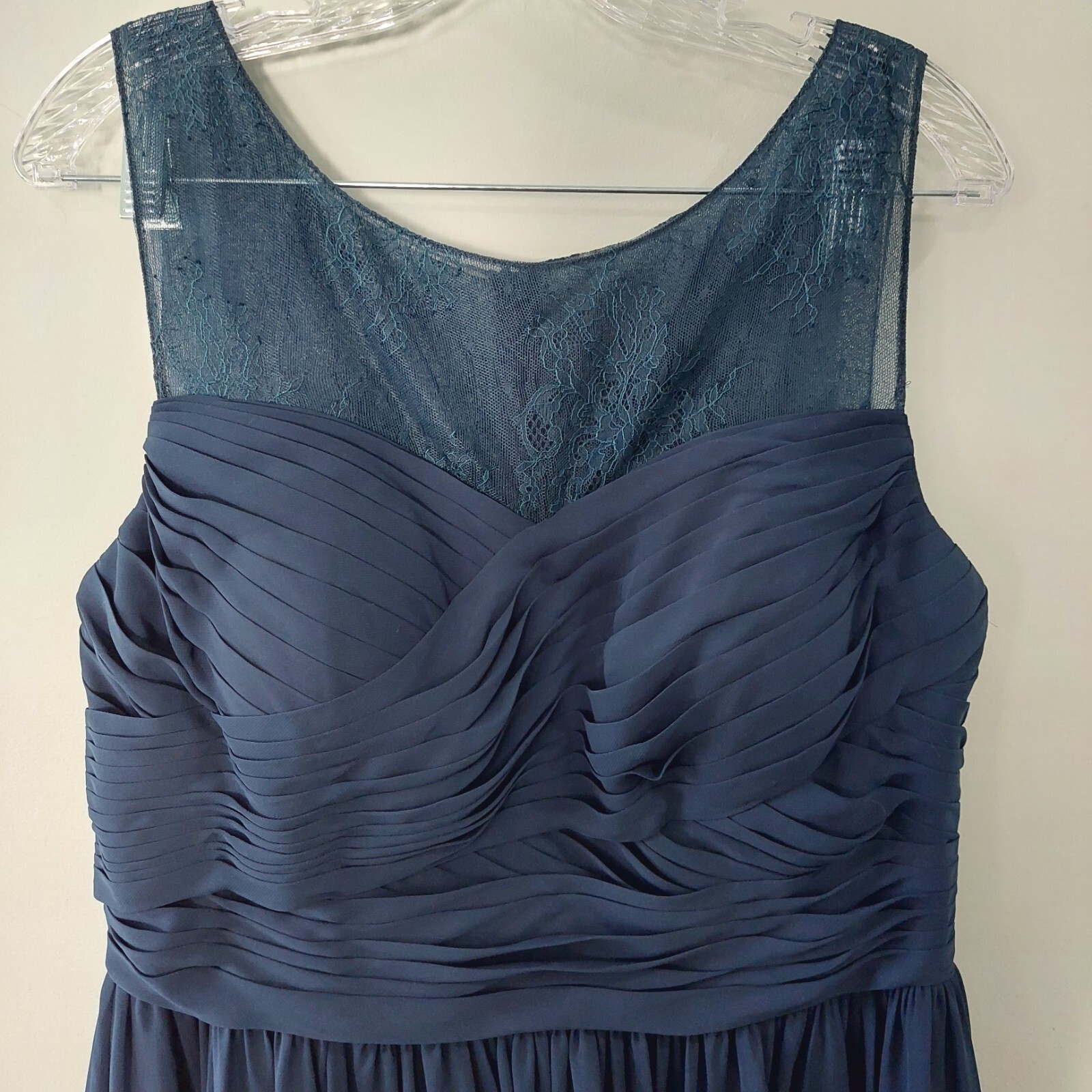 как выглядит Azazie Formal Dress size 12 navy blue chiffon flowly lace top bridesmaid prom фото