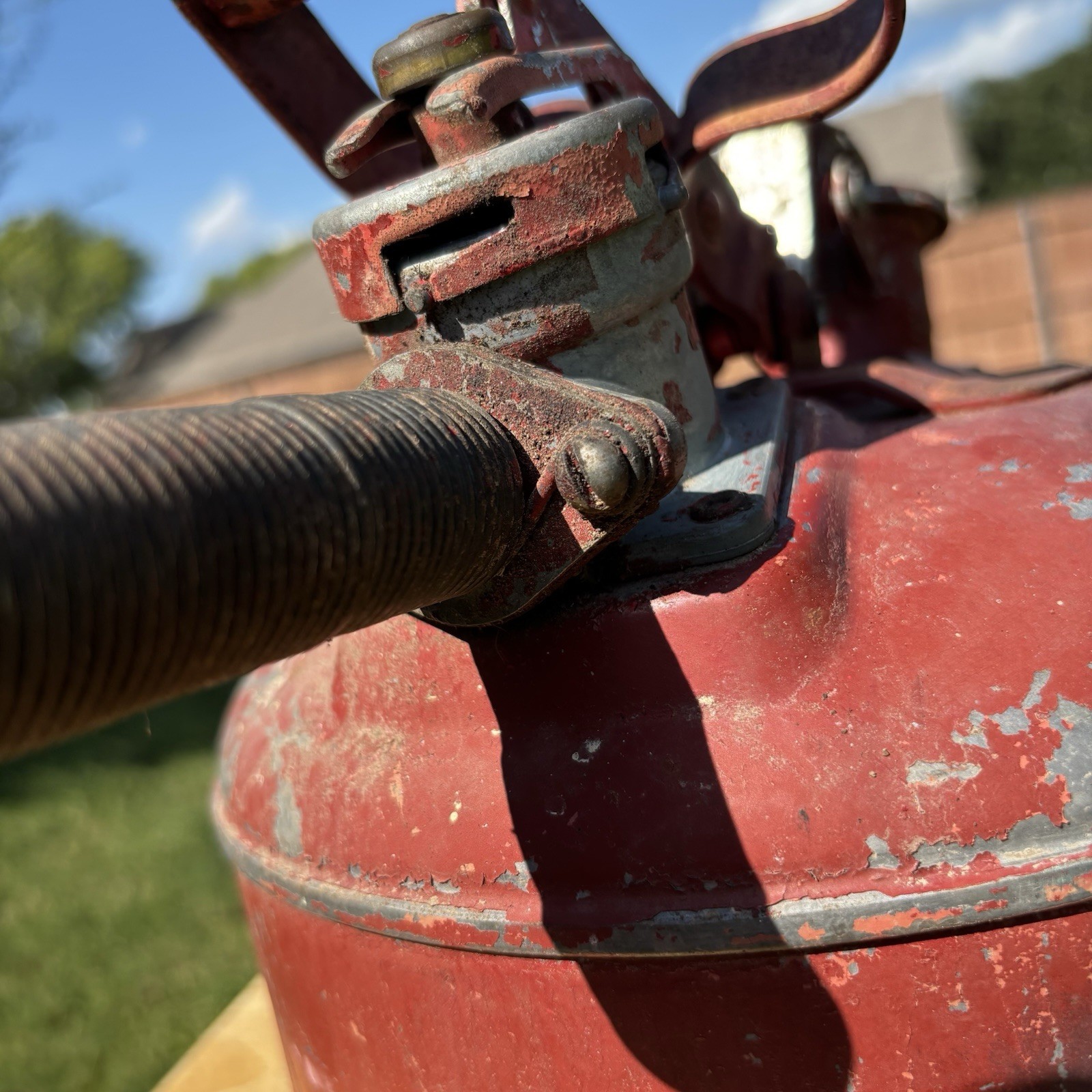 • Vintage Justrite Safety Can Metal Fuel Mix Gas Type 10721 Steampunk Red