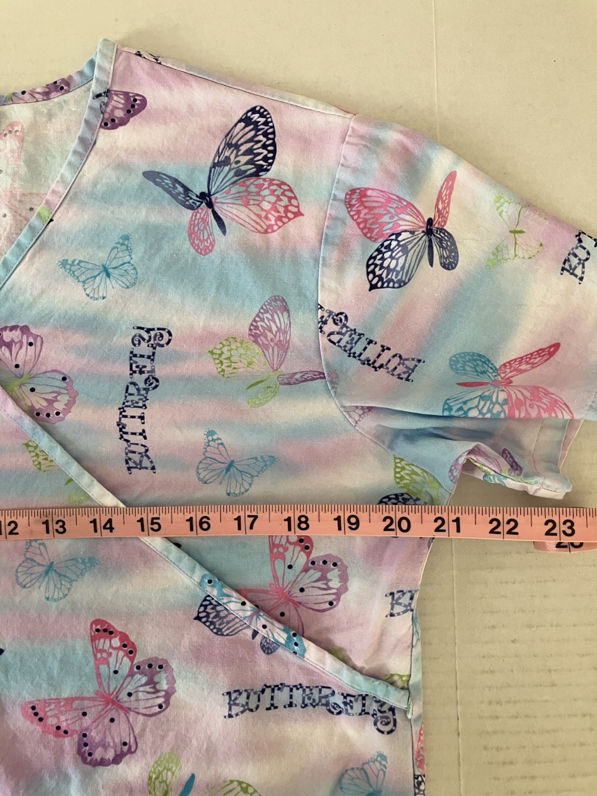как выглядит SB Scrubs Scrub Top Womens Small Pink Blue White Butterfly V-Neck SS фото