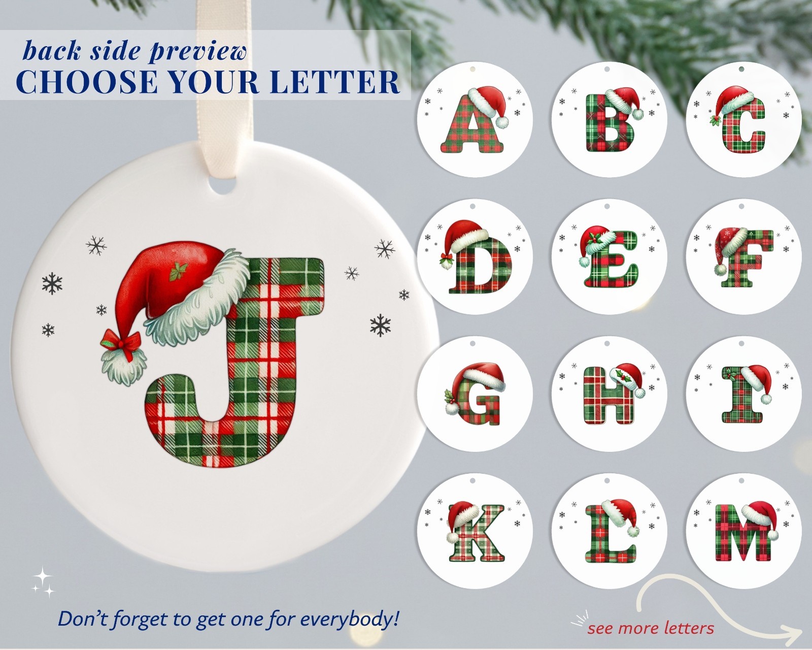 Personalization Instructions: FRONT: Please enter the name and year you would like on the front (2025 is default, or write “no year”). BACK: Please enter one initial letter A–Z for the plaid monogram with Santa hat.