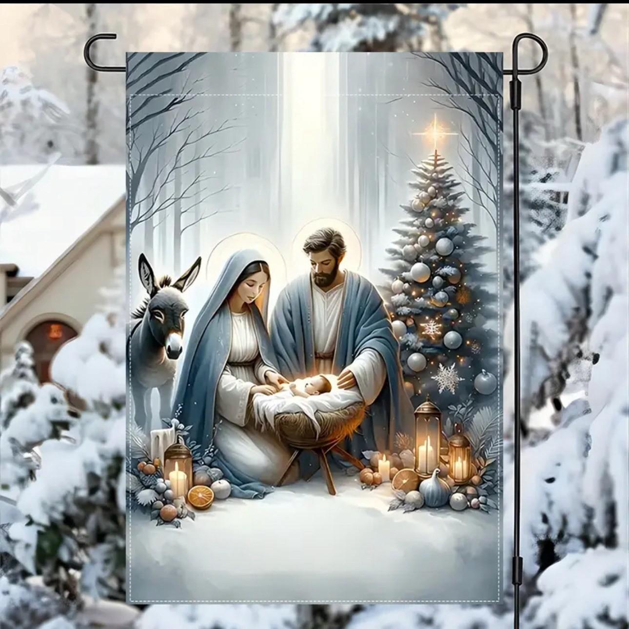 как выглядит Garden flag, 12 x 18 , Christmas nativity scene, burlap polyester double-sided фото
