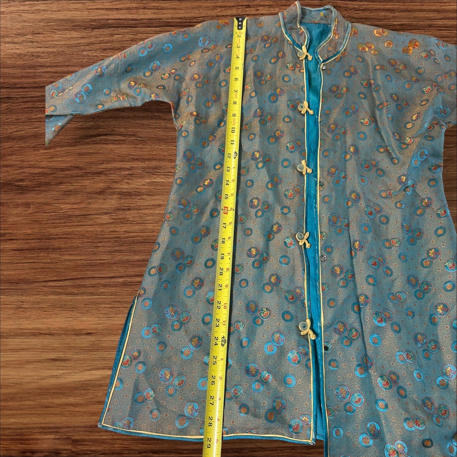 Vintage Asian Inspired Jacket Robe Teal Blue Circle Pattern Frog Closures