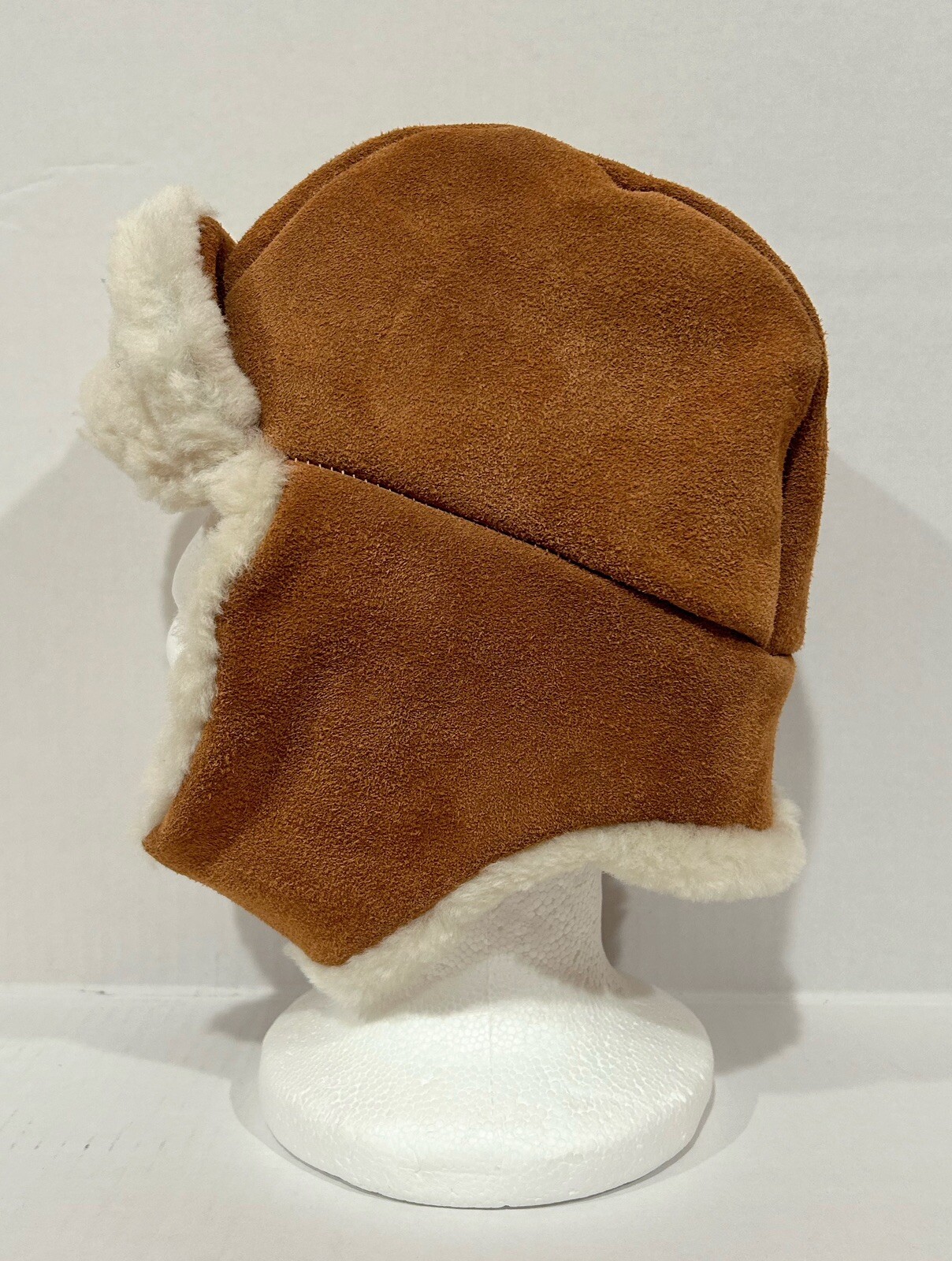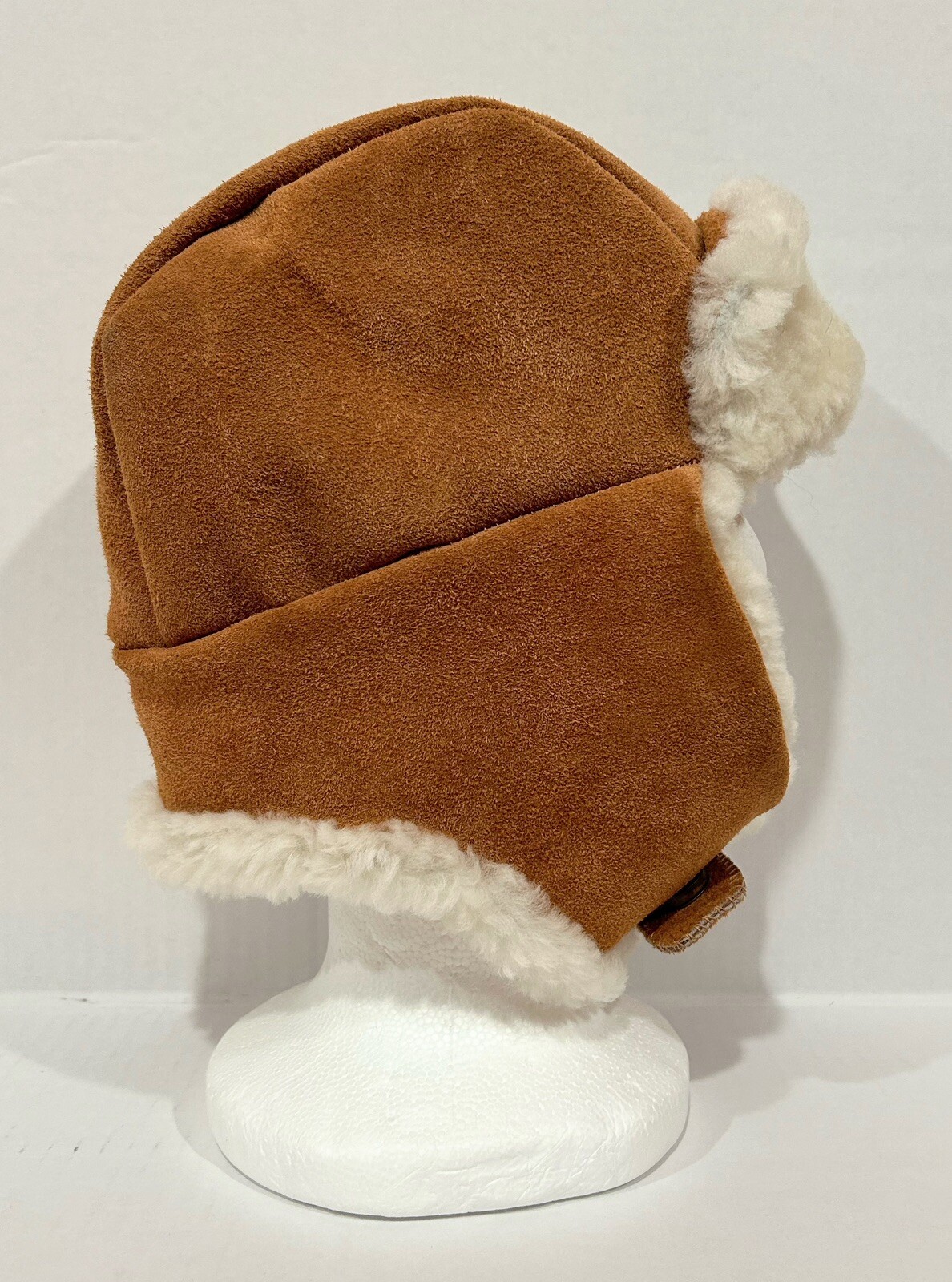 Vintage Shearling Sheepskin Trapper Hat Suede Aviator Pilot Cognac Size S/M