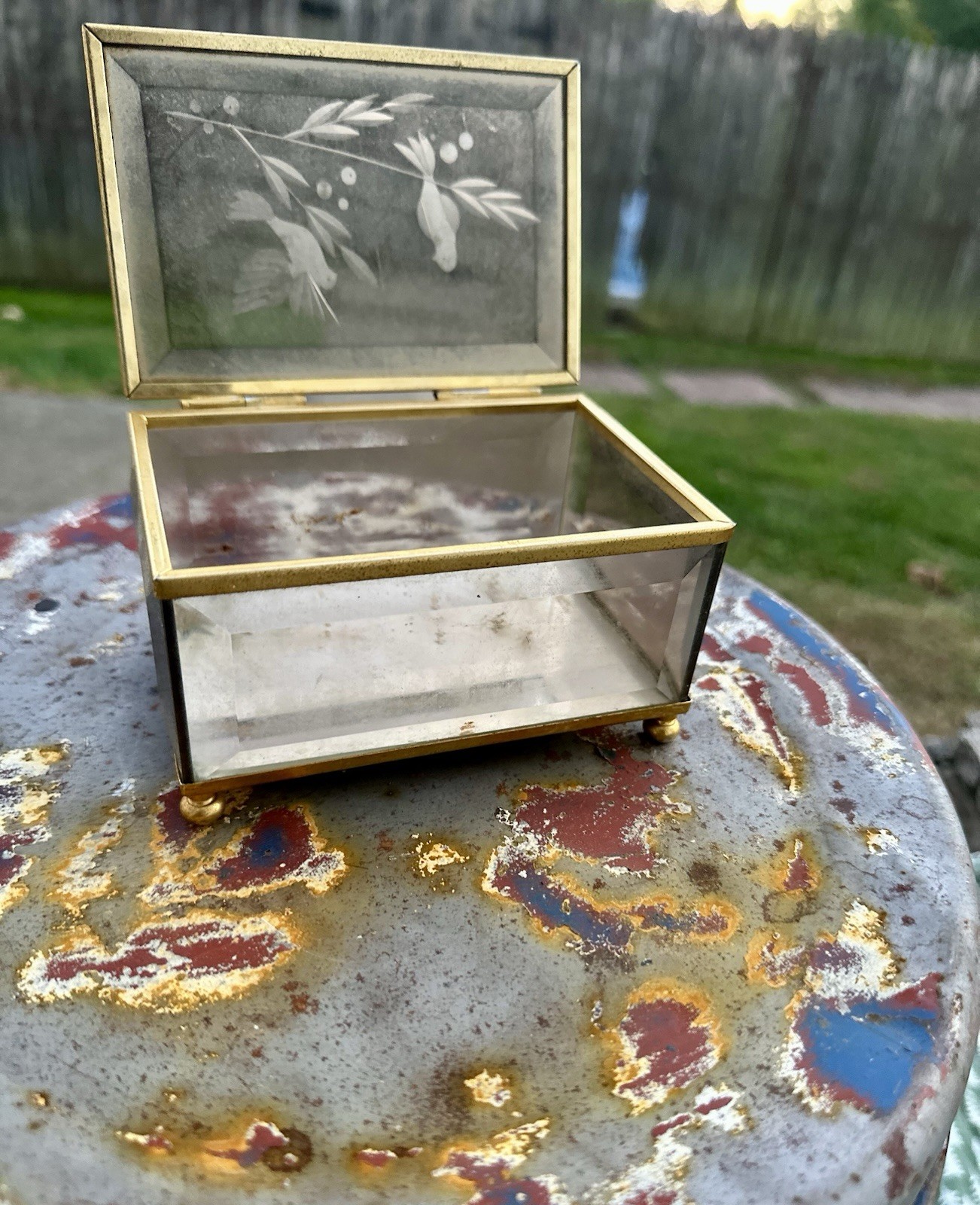 • Vintage Mirrored Footed Brass Tone Etched Bird Beveled Glass Trinket Jewelry Box