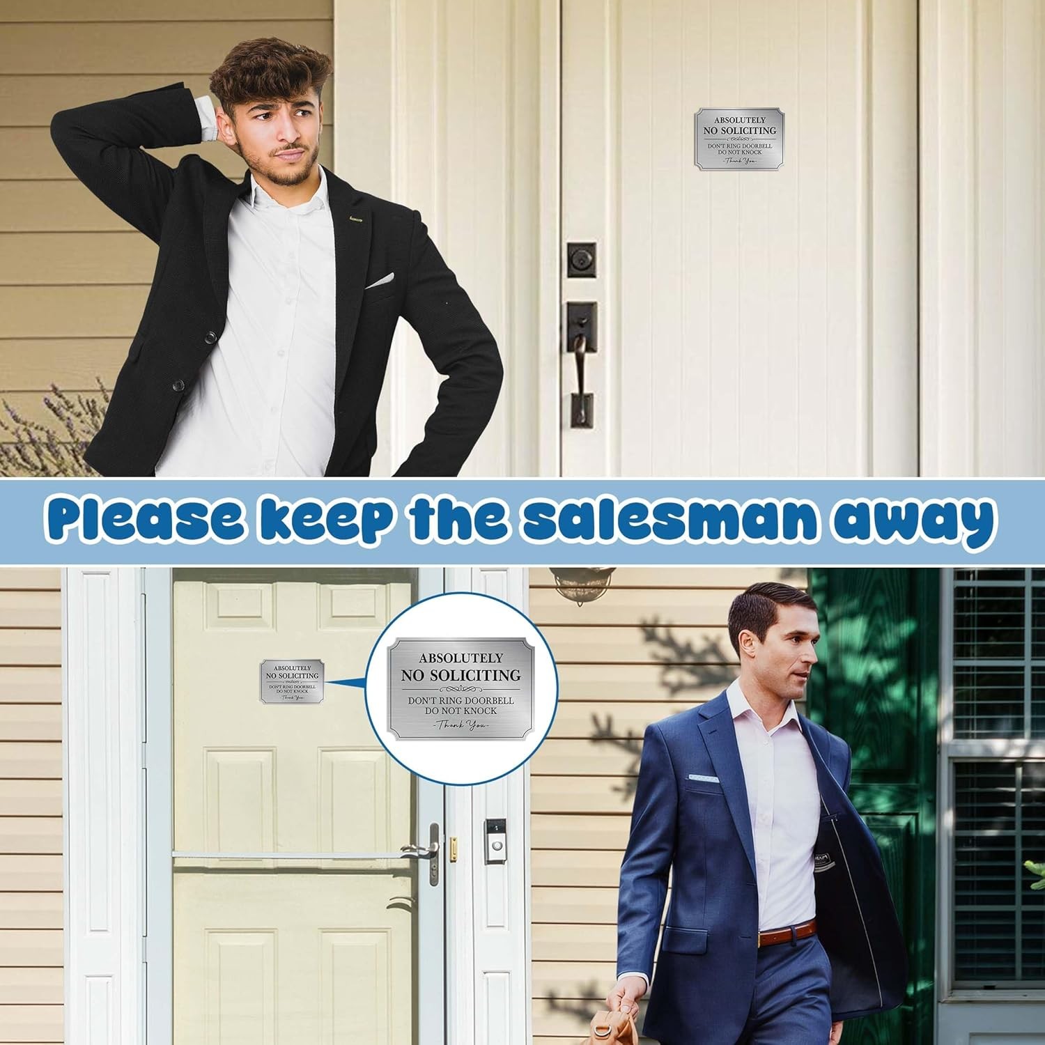 No Soliciting Sign for Front Door Self-Adhesive Brushed Silver Do Not Knock or