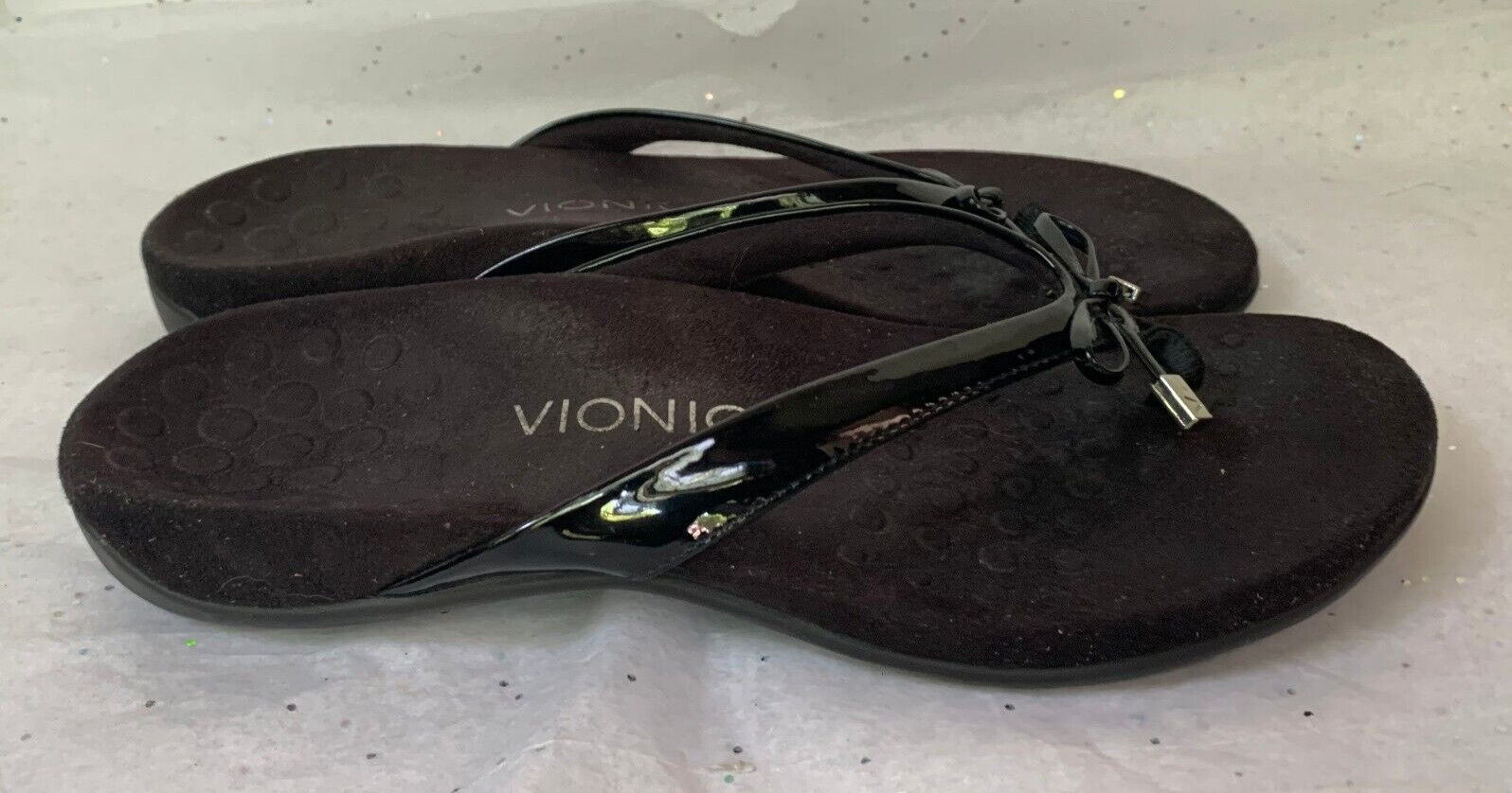 как выглядит Vionic Black Patent Leather Thong Bow Detail Platform Sandal Classic Preppy - 9 фото