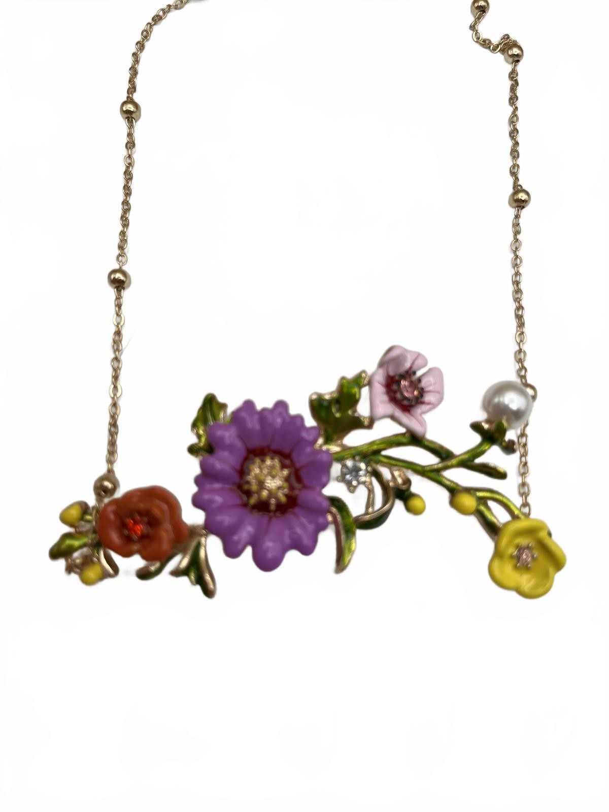 Floral Multicolor Enamel Necklace with Pearl Accent