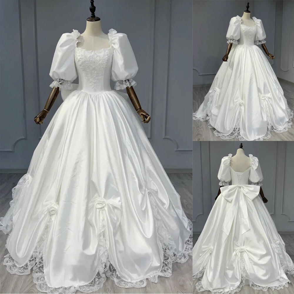 Vintage Satin Wedding Dresses Square Neck Puffy Sleeves Lace Ball Bridal Gowns